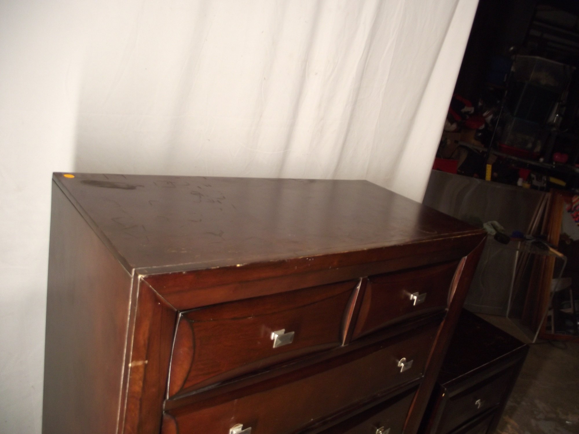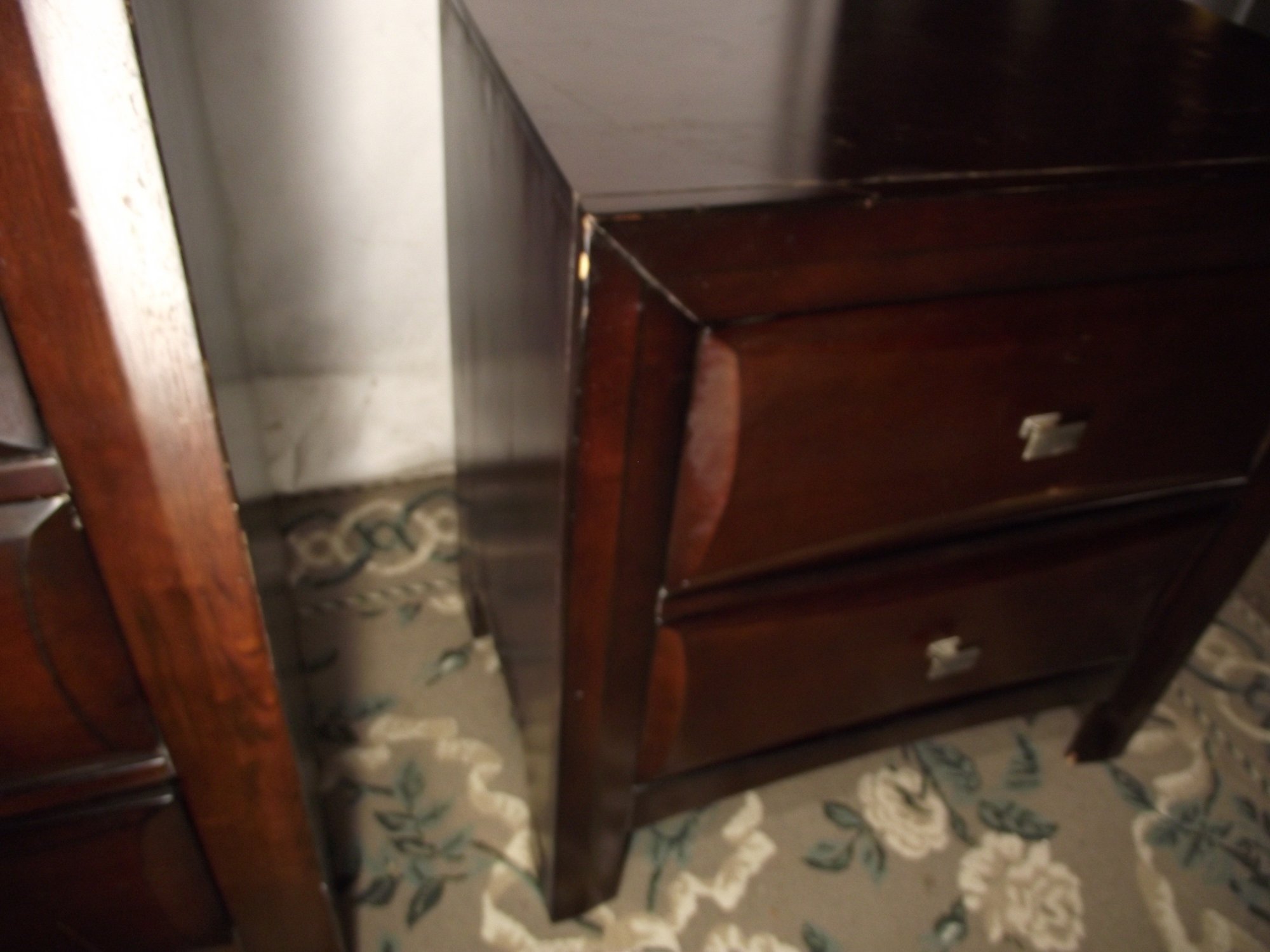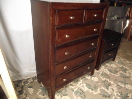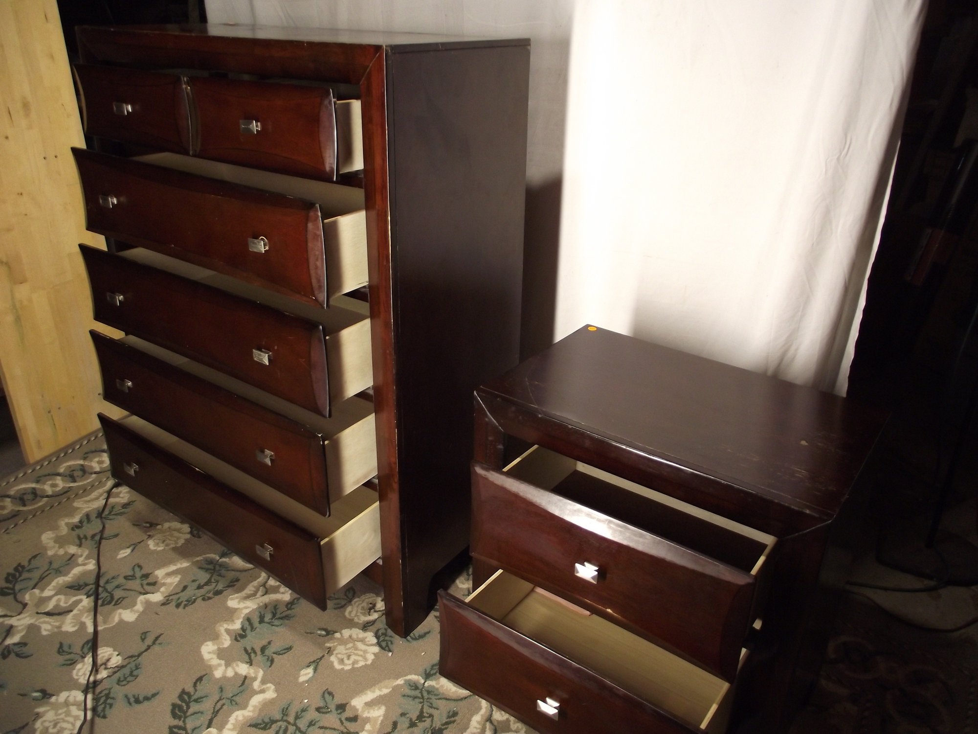 2 PIECE COMBO 6 DRAWER WOODEN DRESSER WITH MATCHING 2 DRAWER NIGHTSTAND. SEE PHOTOS FOR CONDITION.