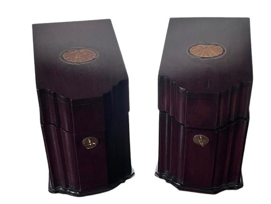 Sloping hinged lid, enclosed slotted and fitted interior.