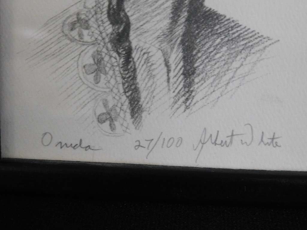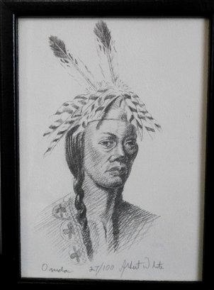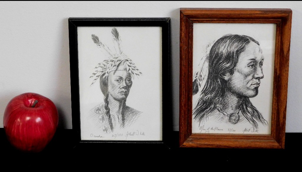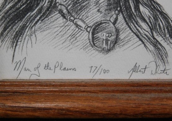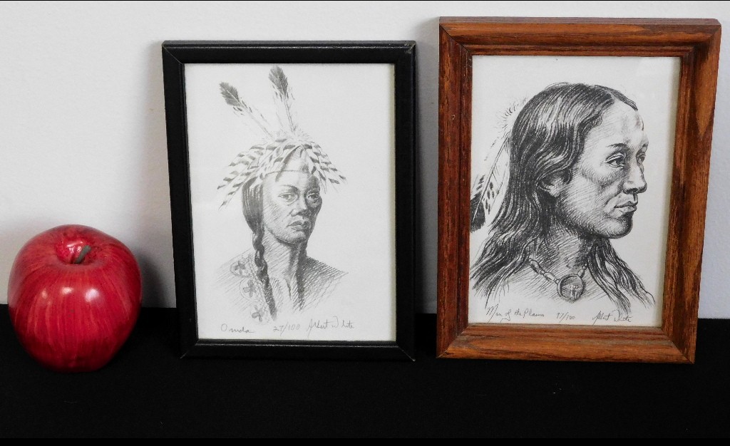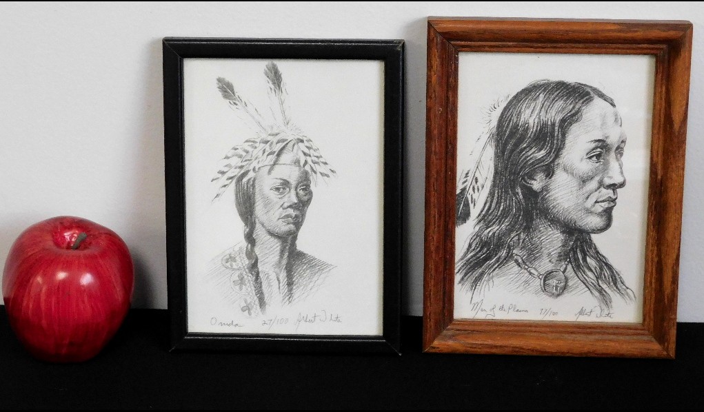 Two small signed Lithographs by Native American Mohawk Indian artist Albert White of Binghampton, NY. Each measure 6" x 8" framed, one titled Onida (spelled that way in the print) #27 Of 100, the other called Man Of The Plains #17 Of 100. Just some of the fascinating Native American artwork being offered in this sale.