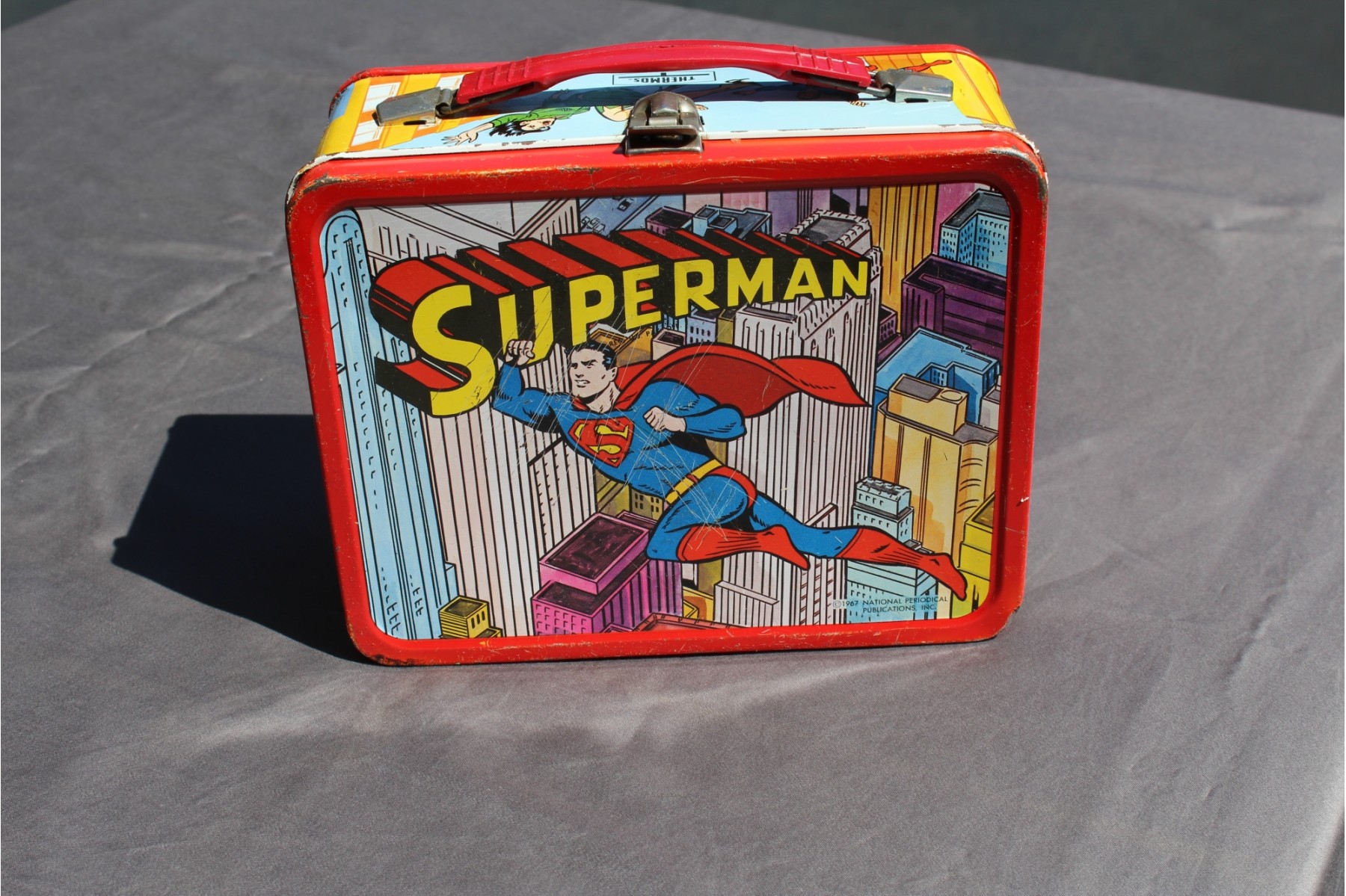 Take a close look at these photos, they are SCRATCHED and they have some rust here and there and the Superman lunchbox was covered by contact paper for over 40 years but I have cleaned much (but not all) of the glue residue off of the Superman (Green Hornet did not have contact paper). There is still more work to be done on the superman and yes there is some paint that is lacking but the colors are bright and they still have a cool look. NO THERMOS with either! 1967, THEY ARE OFFERED "As Is"!