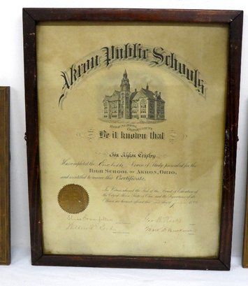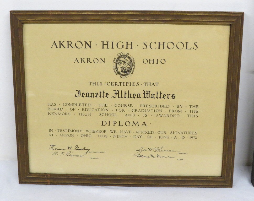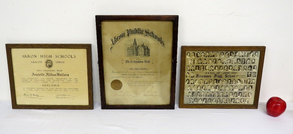 Three pieces, all related to the High Schools in Akron, Ohio c.1932 or thereabouts. Two graduation certificates from the Akron High School, one class photo from the Kenmore HIgh School.