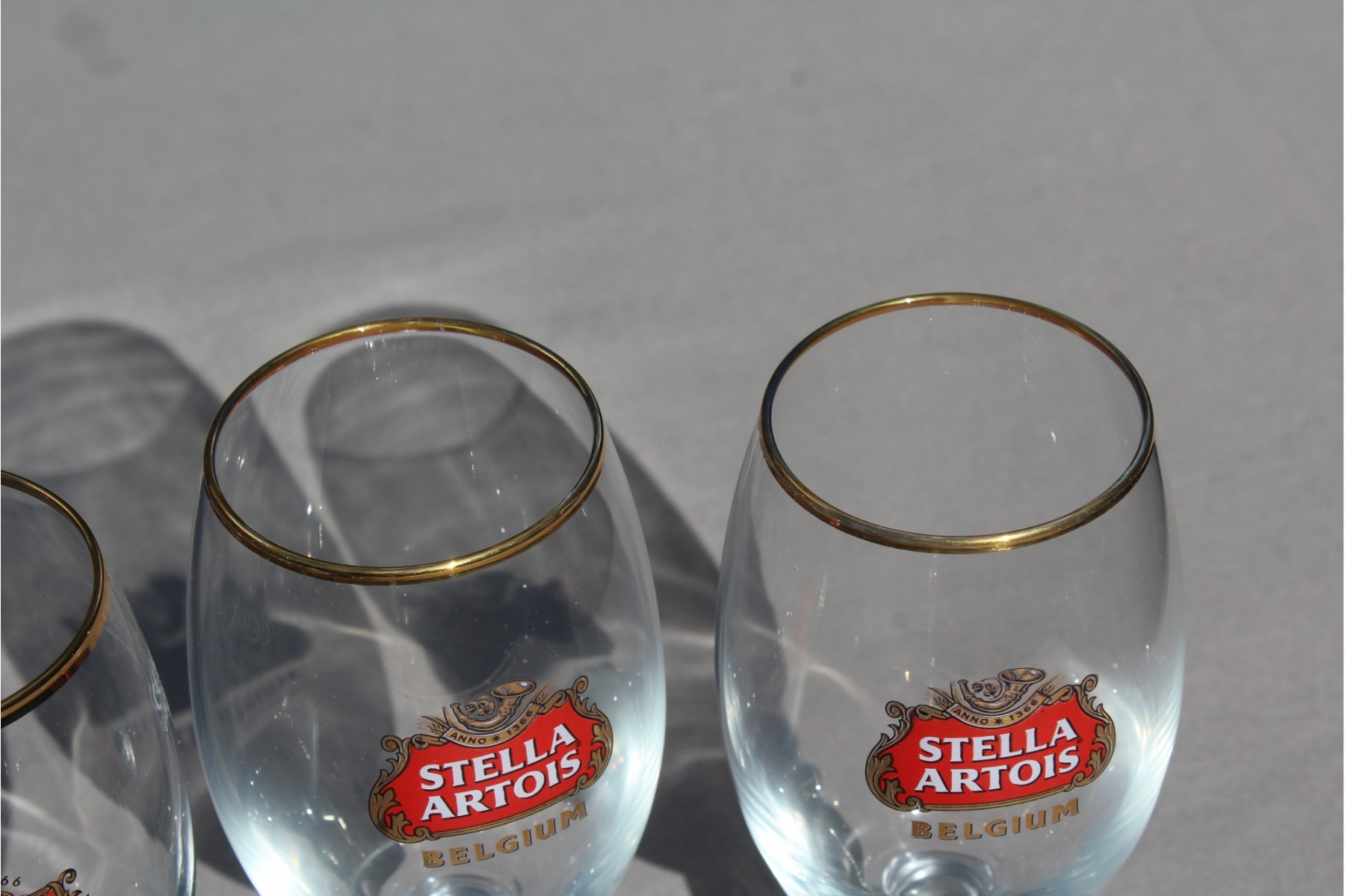 This is a set of 3 Stella Artois Glasses with gold rims The gold rims on this set are very good and glasses in great shape!