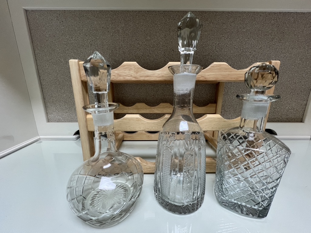 3 clear glass decanters with wood wine rack, all is very nice condition, if ever used.