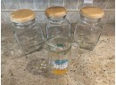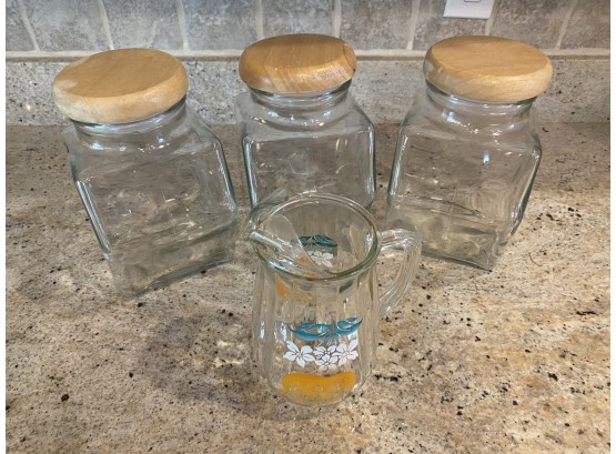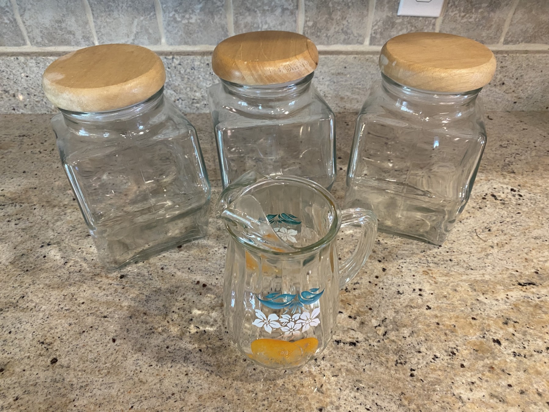 canisters have wood lids with plastic undersides and orange juice pitcher is vintage