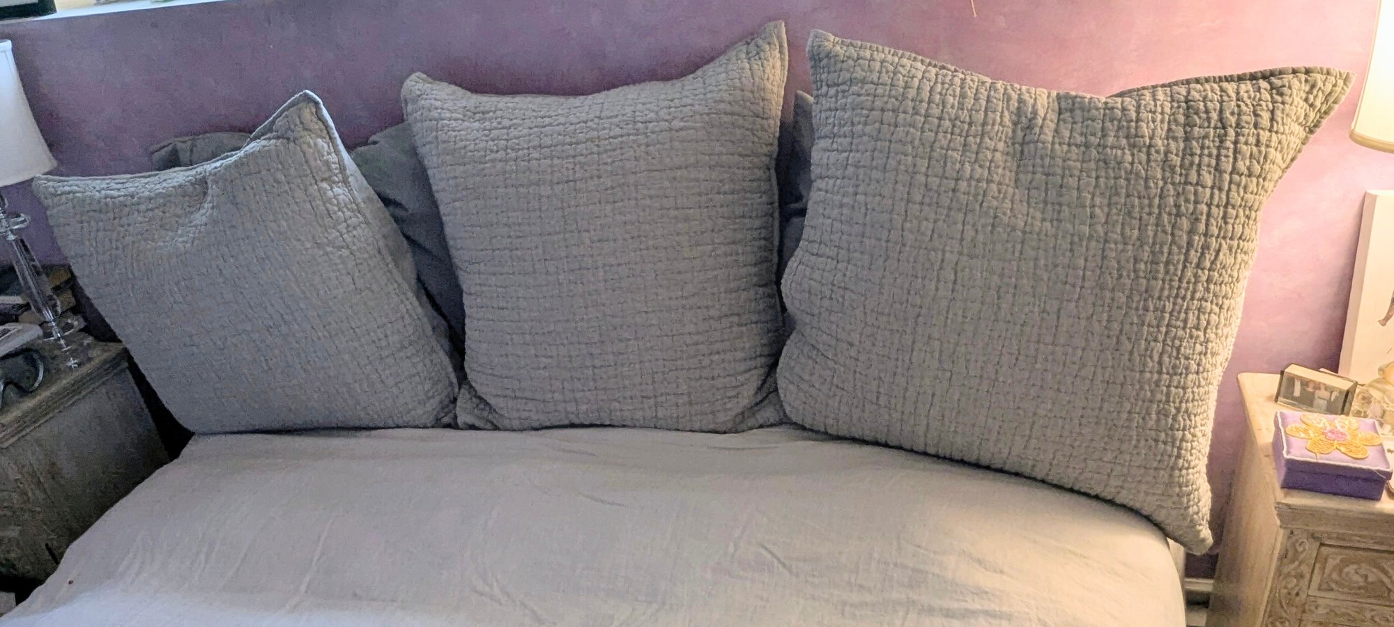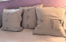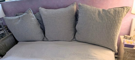 25"x 26" , I believe the pillows are an alternative down luxury pillow. The fabric is a soft cotton and viscose blend.