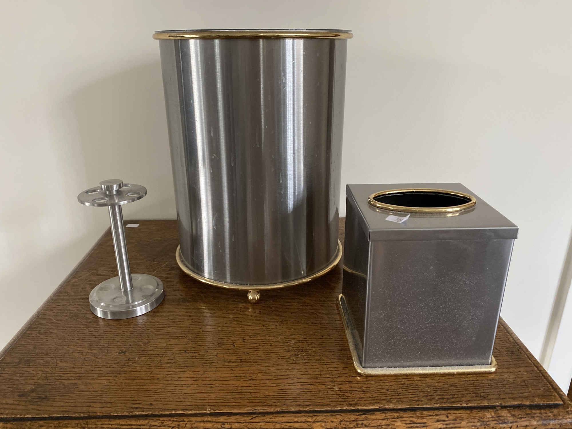 Includes wastebasket, tissue box holder, and toothbrush holder.
