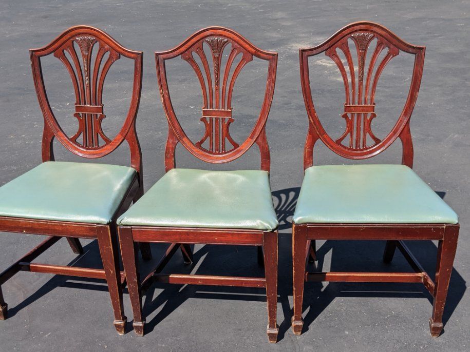 These are Mid-Century, dating to late 1950's possible early 1960's You have the basics for a restoration. 100% Mahogany, Hepplewhite design. Singles can go for several $100's.