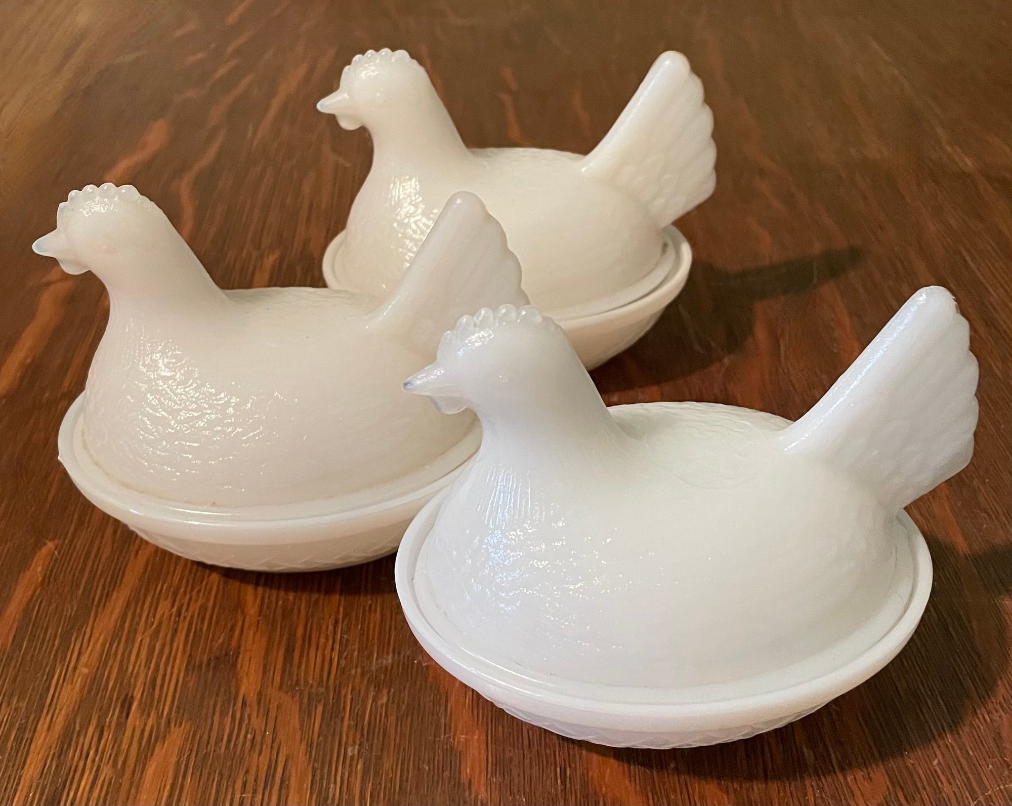 Three lovely milk glass chickens. They are in very good condition, and each about 5 1/2" long and about 3 1/2" tall.