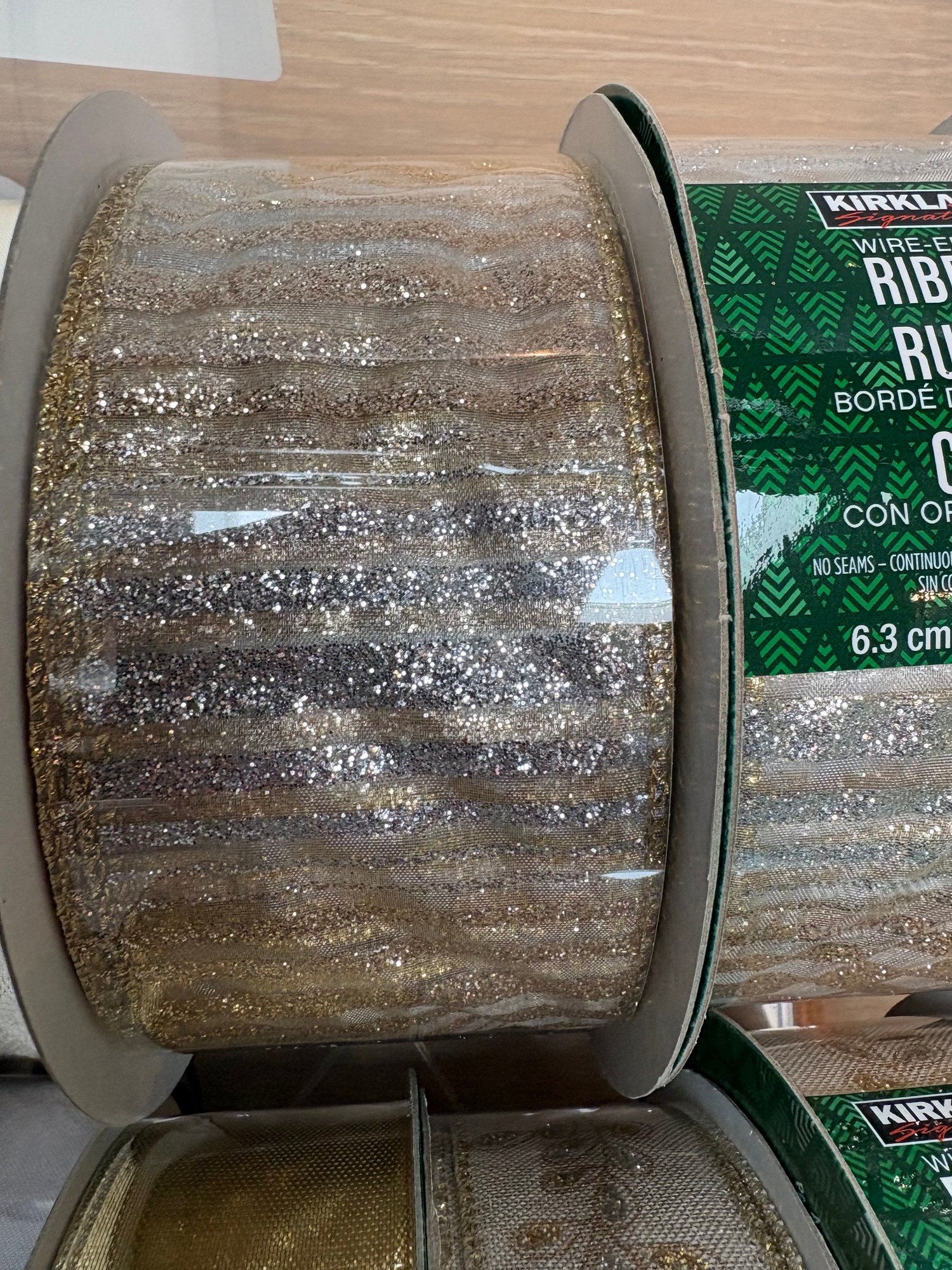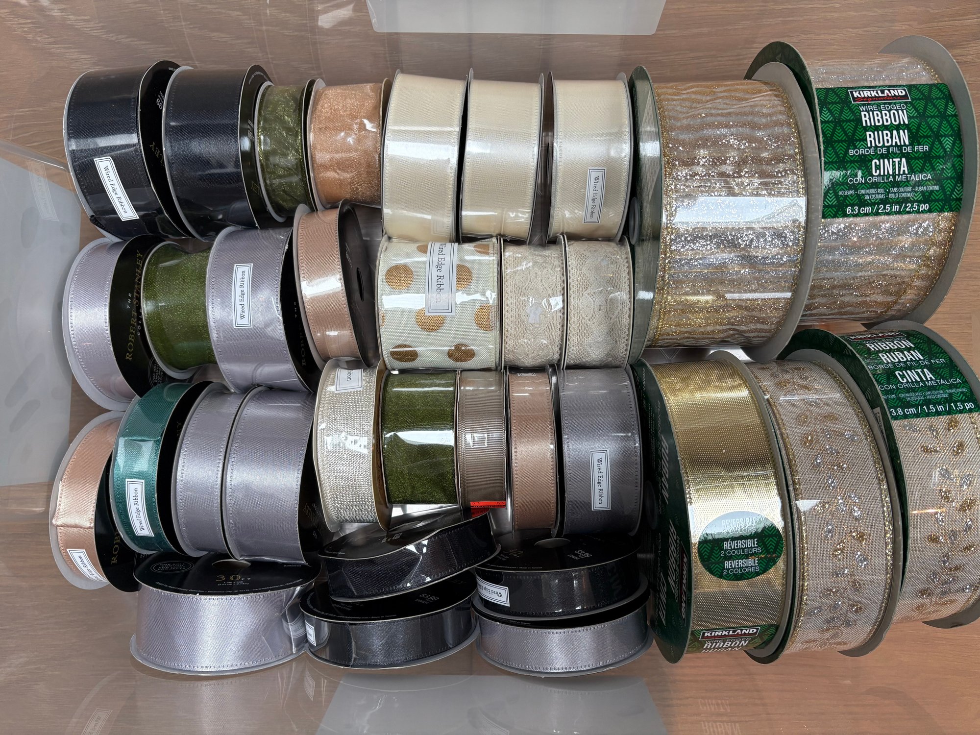 This grouping of ribbon includes some forest green, pale peach, metallics, silver, cream and polka dot patterns.