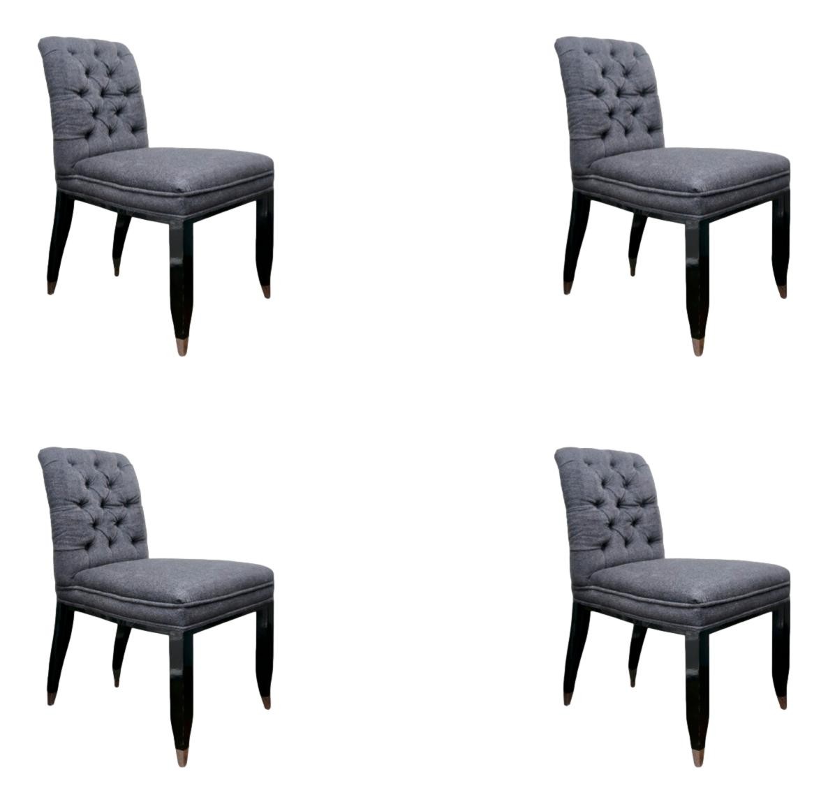 Sink into comfort with this set of button tufted charcoal grey upholstered dining side Eichholtz Fitzroy Anthracite Cashmere side chairs. The plush, button-tufted backrest and soft, piped cushioned seat offer both style and support, while the dark legs with silver capped feet add a classic touch. A perfect addition to any dining or living space.