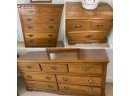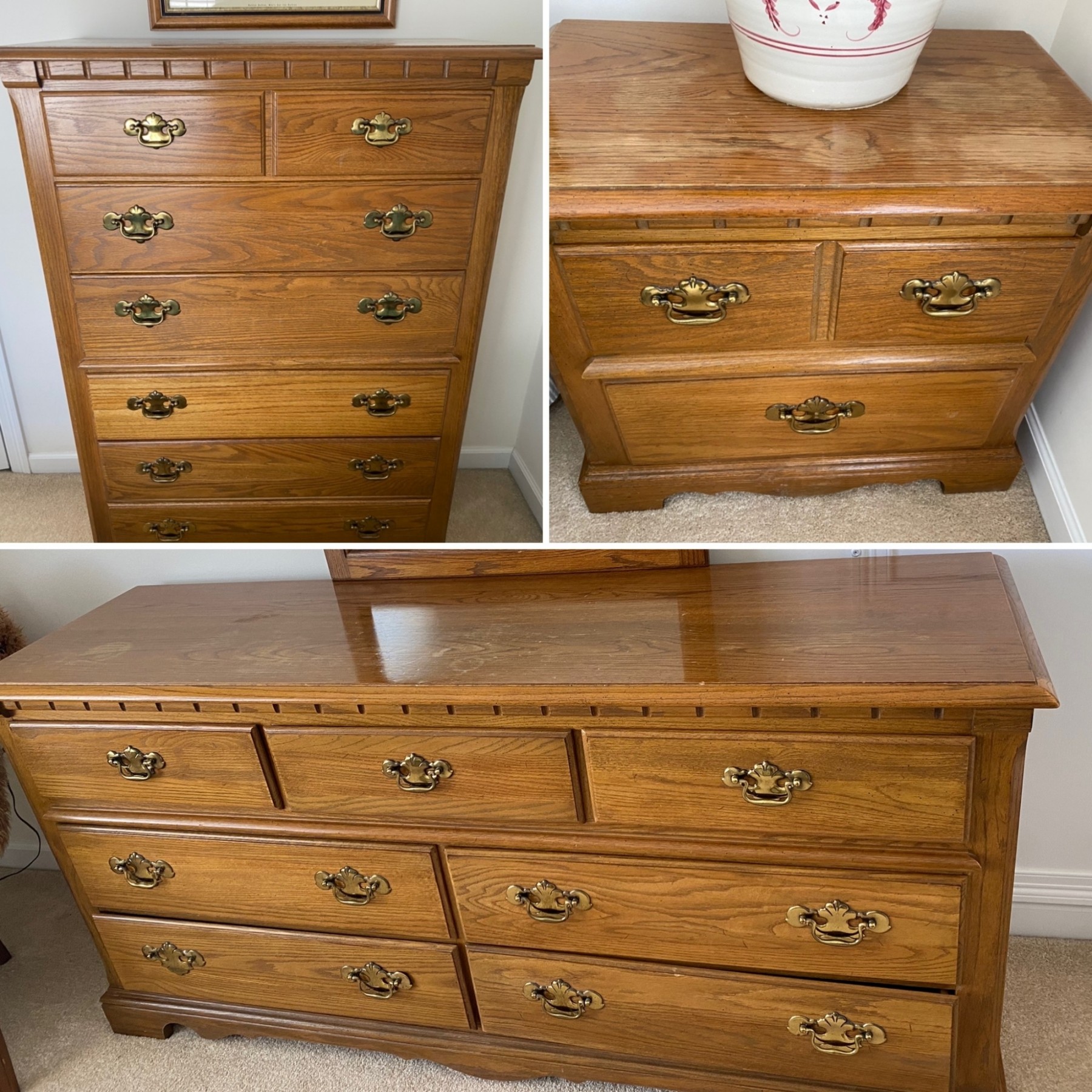 set includes long 7 drawer dresser 63x18x31 marks on top; mirror 28 x 46, tall dresser 7 drawer 36 x 18 x 54; night stand 26 x 16 x 25 2 drawer watermark on top
