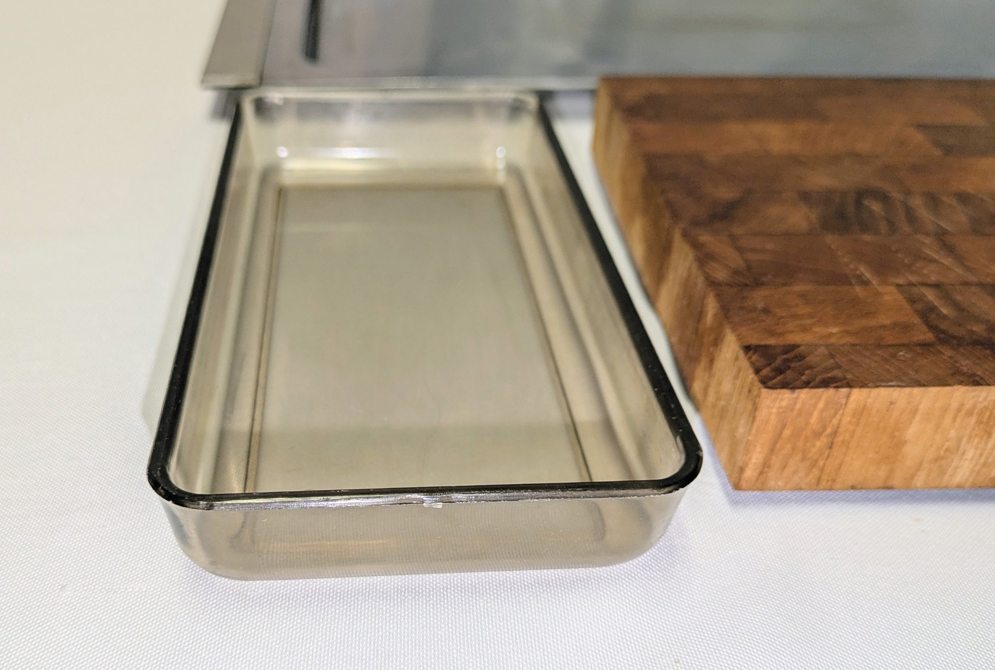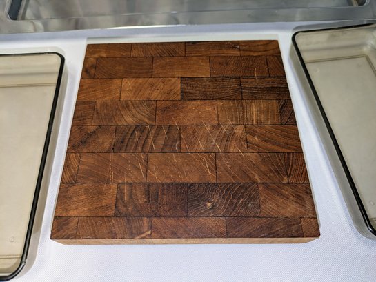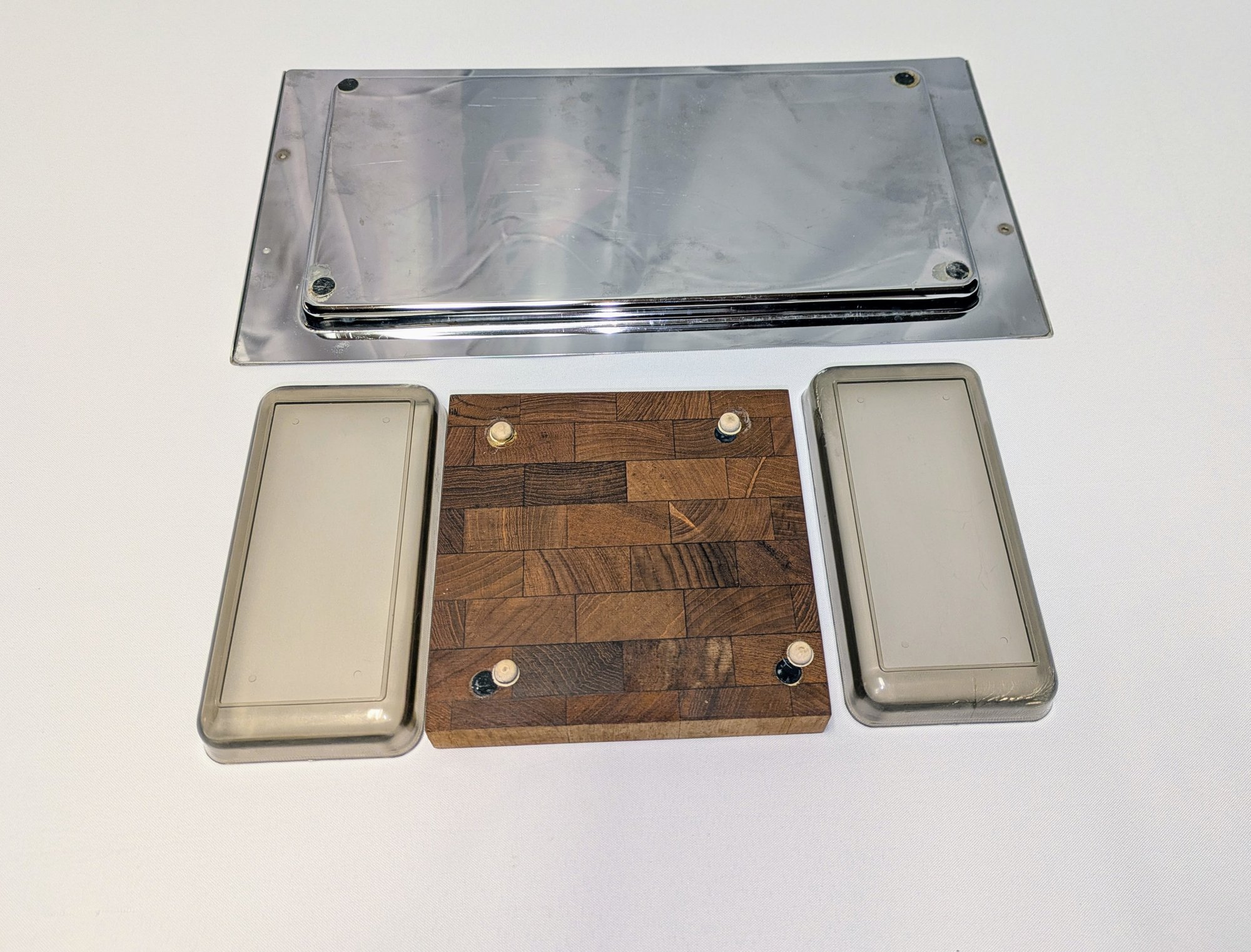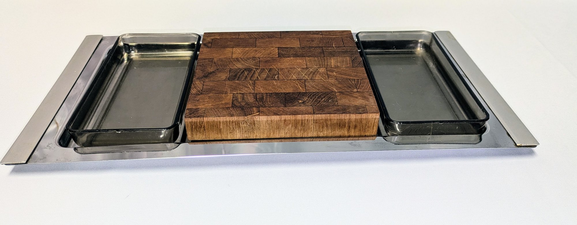 4 Piece Stainless, Plastic & Wood Block Cheese & Cracker/Condiment Serving Set. Stainless Serving Tray with Wood Block Cheese Board and 2 Plastic Rectangular Insert Cracker/Condiment Trays on Each Side. Wear and marks are consistent with age and use. Please see all photos as part of the description and condition. Serving Tray 19.25" x 9" / Rectangular Plastic Insert Trays 1"H x 7.5" x 3.5 / Wood Block Cheese Board (center) 1.25"H x 6.75" Square