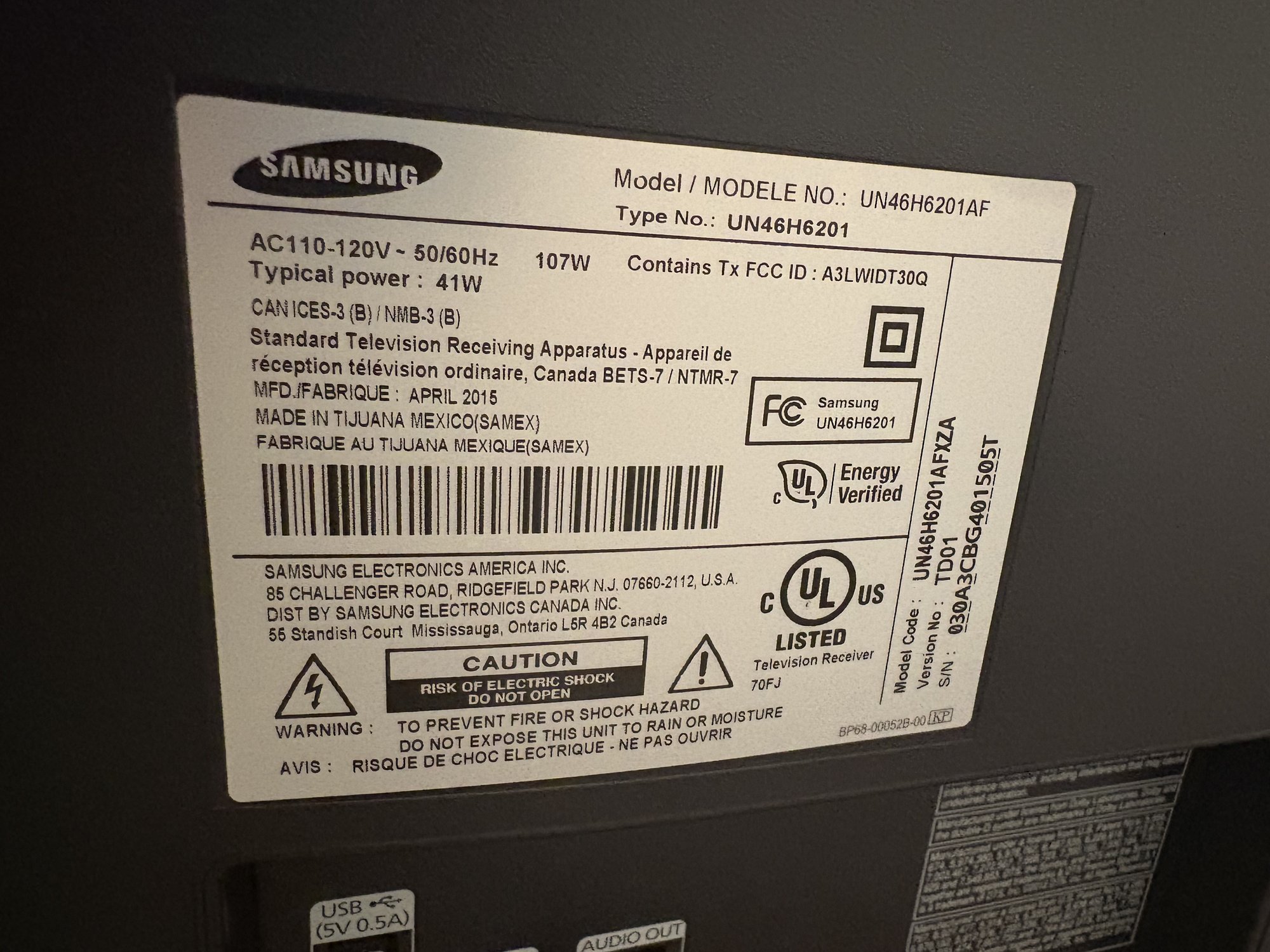 41 Inch Samsung Smart TV Model # UN46H6201AF