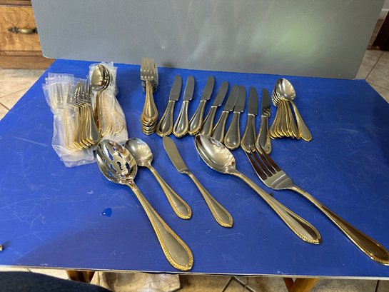 8 dinner forks, 8 salad forks, 8 knives, 8 soup spoons, 8 tea spoons 5 pc. serving pcs. Additional service for 8 in separate lot.