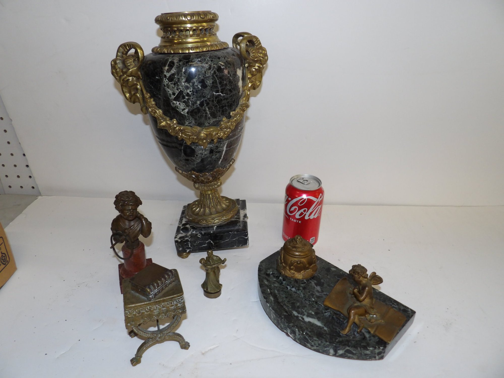 5 Decorative Bronzes Includes 2 Inkwells, Large Marble Urn Missing 2 Feet, 2 Other Bronzes
