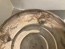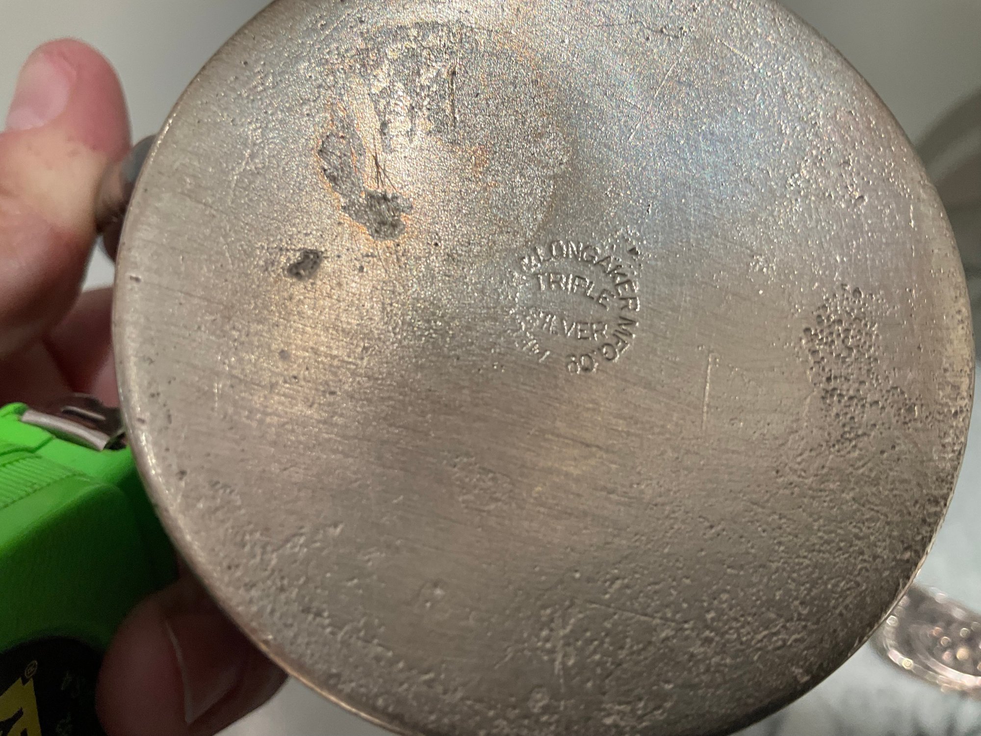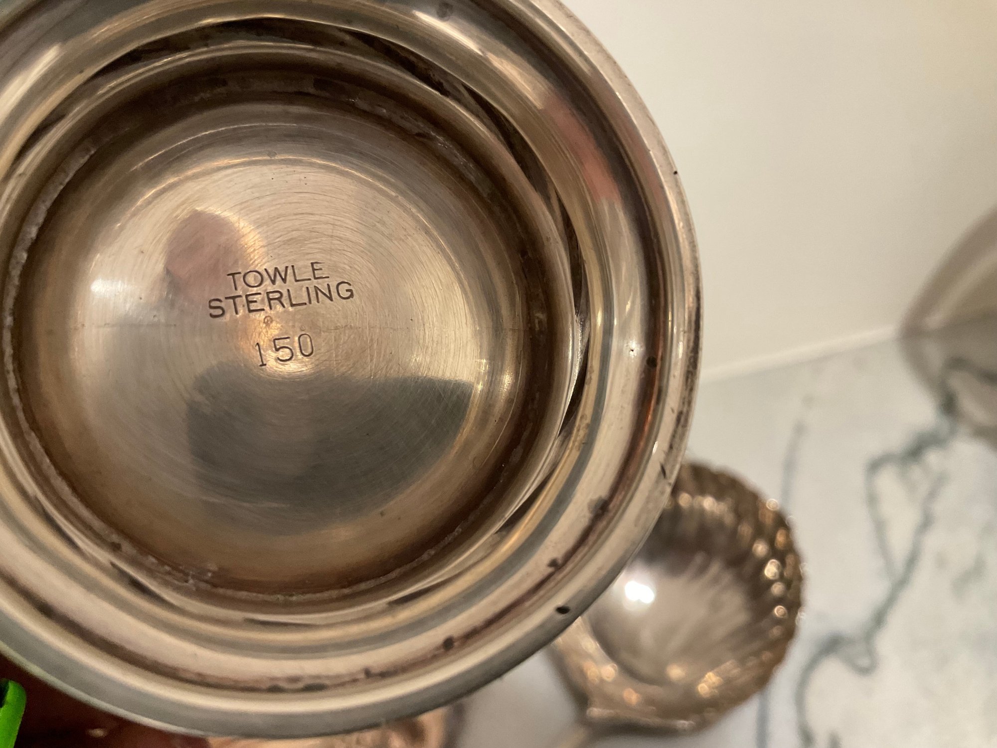 This lot includes a gorgeous STERLING pedestal dish with flower basket design-marked Sterling 54 (9”x4.5” h), STERLING creamer marked Towle Sterling 150 (4”h), Francis I STERLING cake server (9.5”), scallop shell design ladle (unmarked) 8”, and an 1897 engraved 3 handled cup-not sterling- marked Longaker Mfg Co., Triple Silver (3”h)