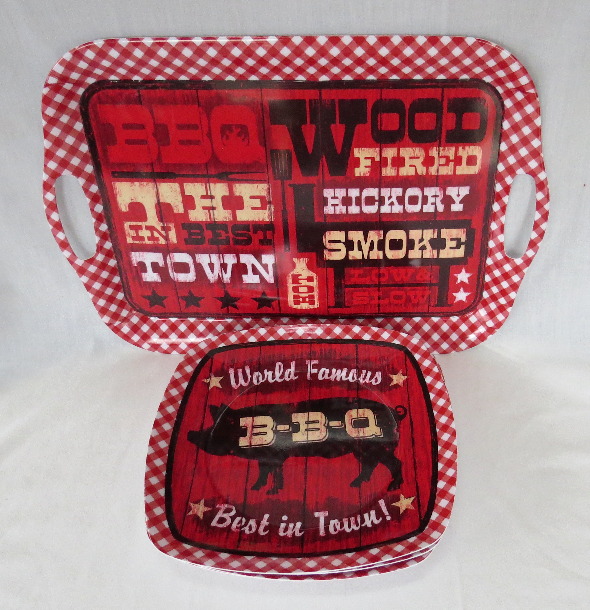 BBQ season is here! A nice little set of Melamineware, 5 plates and a tray. Melamineware is sturdy and will not give or bend like paper plates or less quality plasticware. Tray has built in handles for easy carrying and measures 18" X 13". Plates are square and measure 10 1/4". They have a small inward slant and are not completely flat so your favorite foods do not slide off the edges. Little to no use.