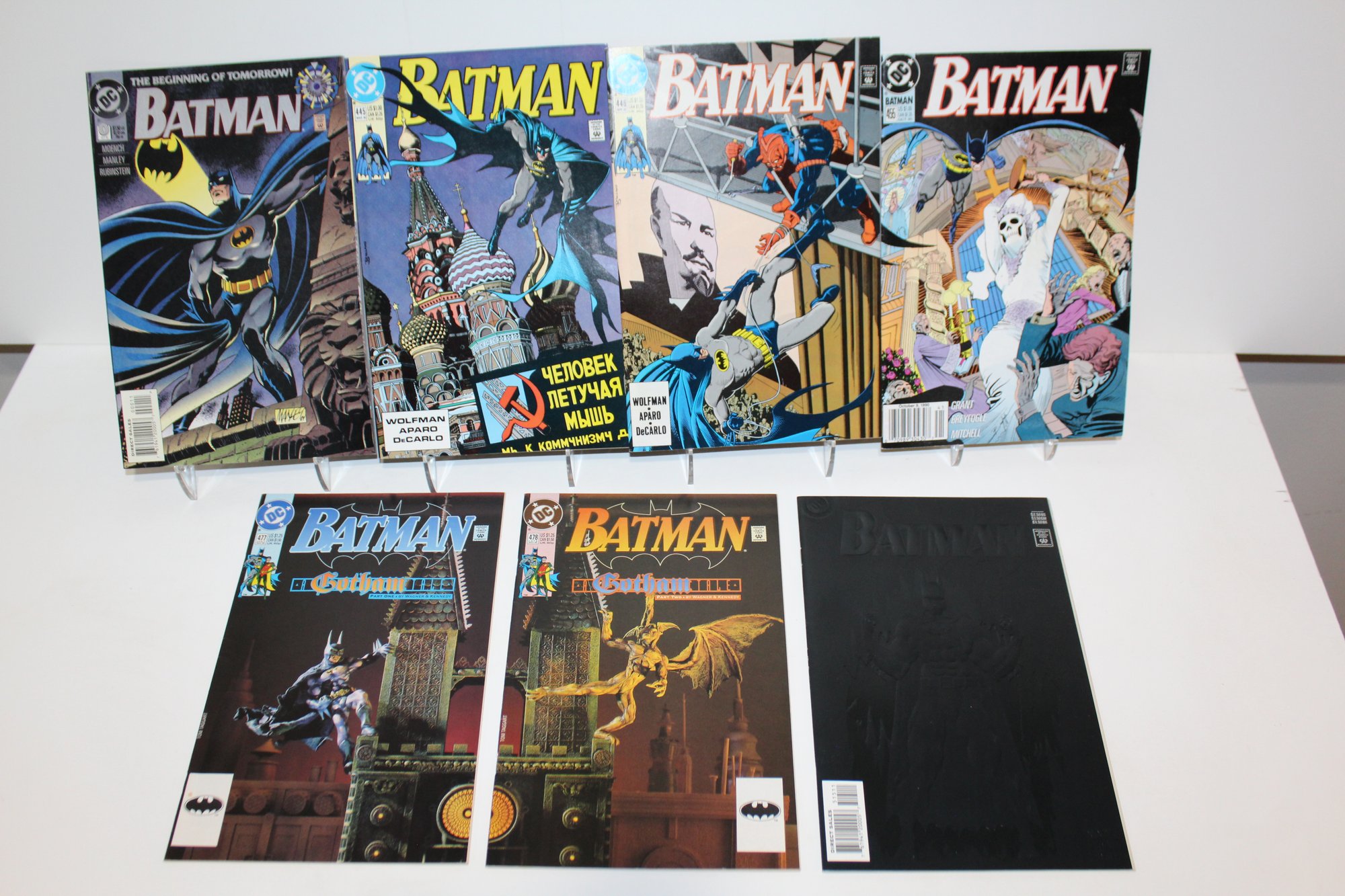 #515 1995 Black Embossed cover, "Part 1 of the 4-part 'Troika.' A new era begins for the Dark Knight as Bruce Wayne adopts a fearsome new look for his battle against a group of renegade Russians."