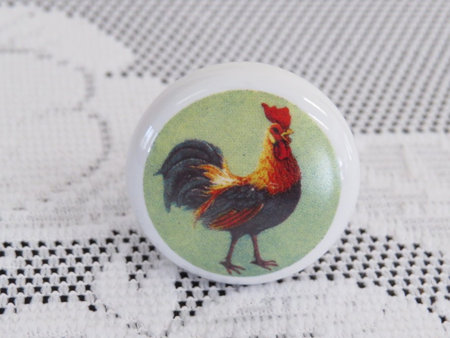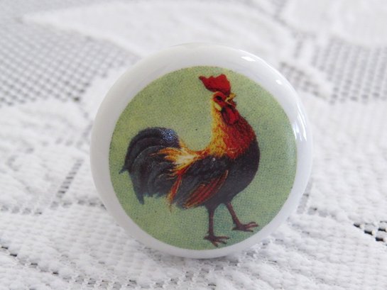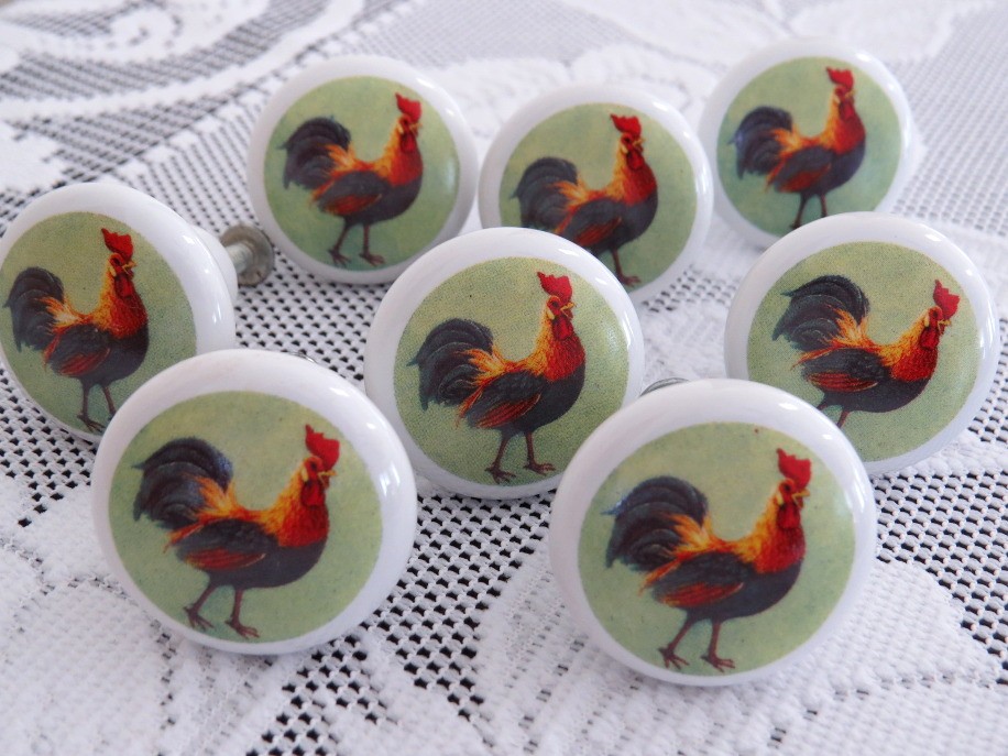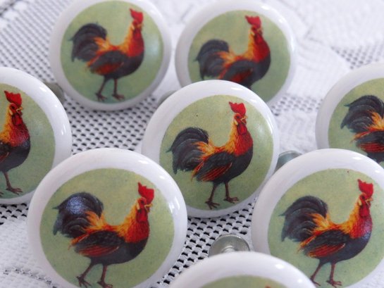 Add a bit of country farmhouse decor to your kitchen cabinets, server, country cupboard etc. with this lot of 8 round shaped ceramic drawer knobs with colorful rooster motif. All include screws and measure 1.25" in diameter and 1" deep. These are identical to the 8 Ceramic Rooster Themed Drawer Knobs - Lot 2 in this auction.