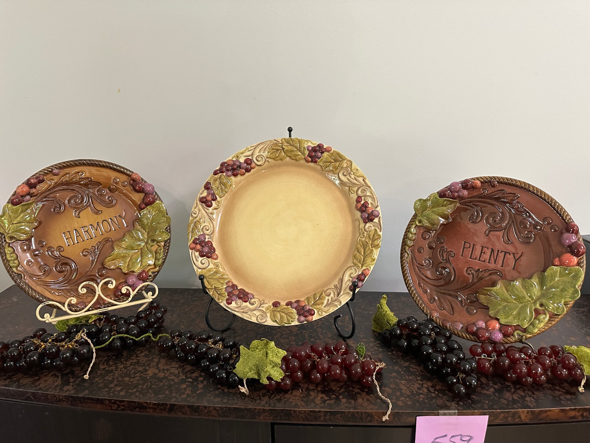 8 grassland road dinner plates; 2 grasslands road side plates; bunches of glass grapes