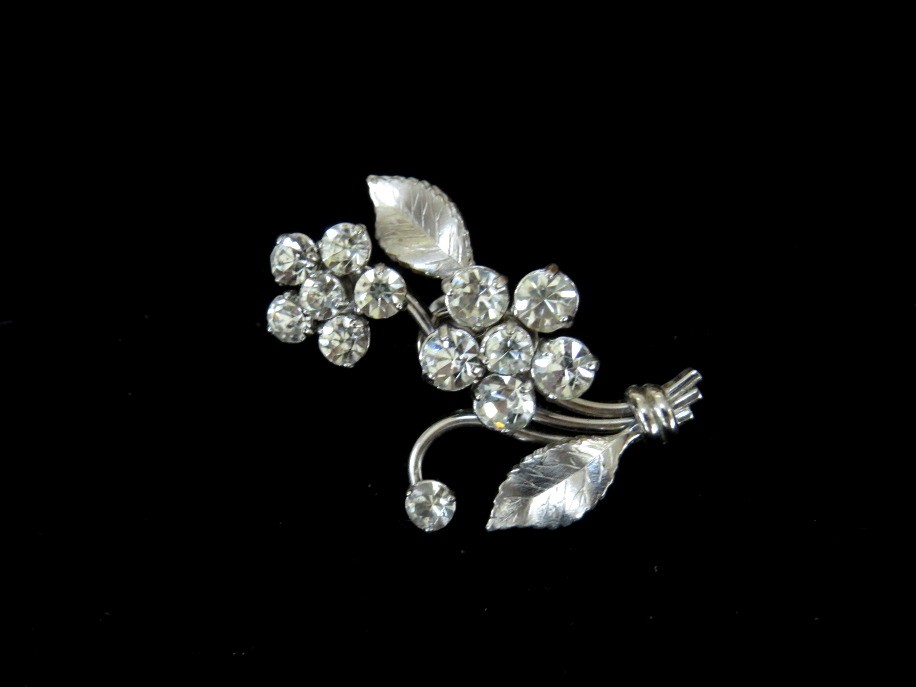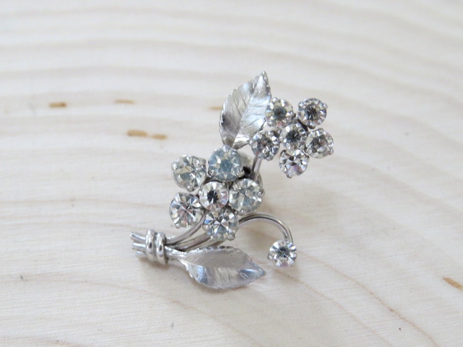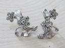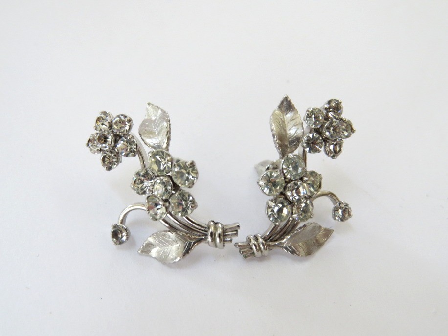 Nature inspired rhinestone floral design stud earrings. Posts are marked 925. Leaves are crafted in a brushed silver finish with visible veining detail. Measure 1" long.