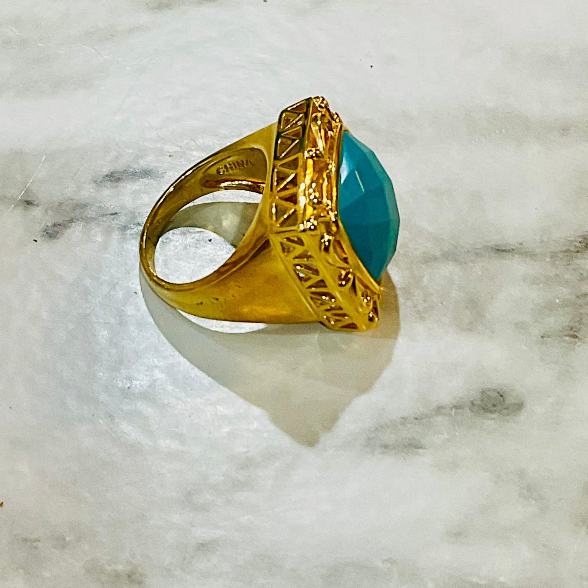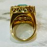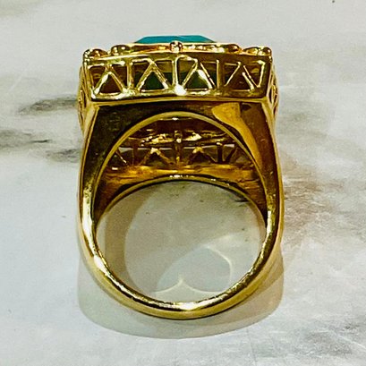 Mid 20th C Vintage Bold Statement Cocktail Ring – 925 With Gold-Tone Ornate Filigree Setting with Large Faceted Square Turquoise Cabochon