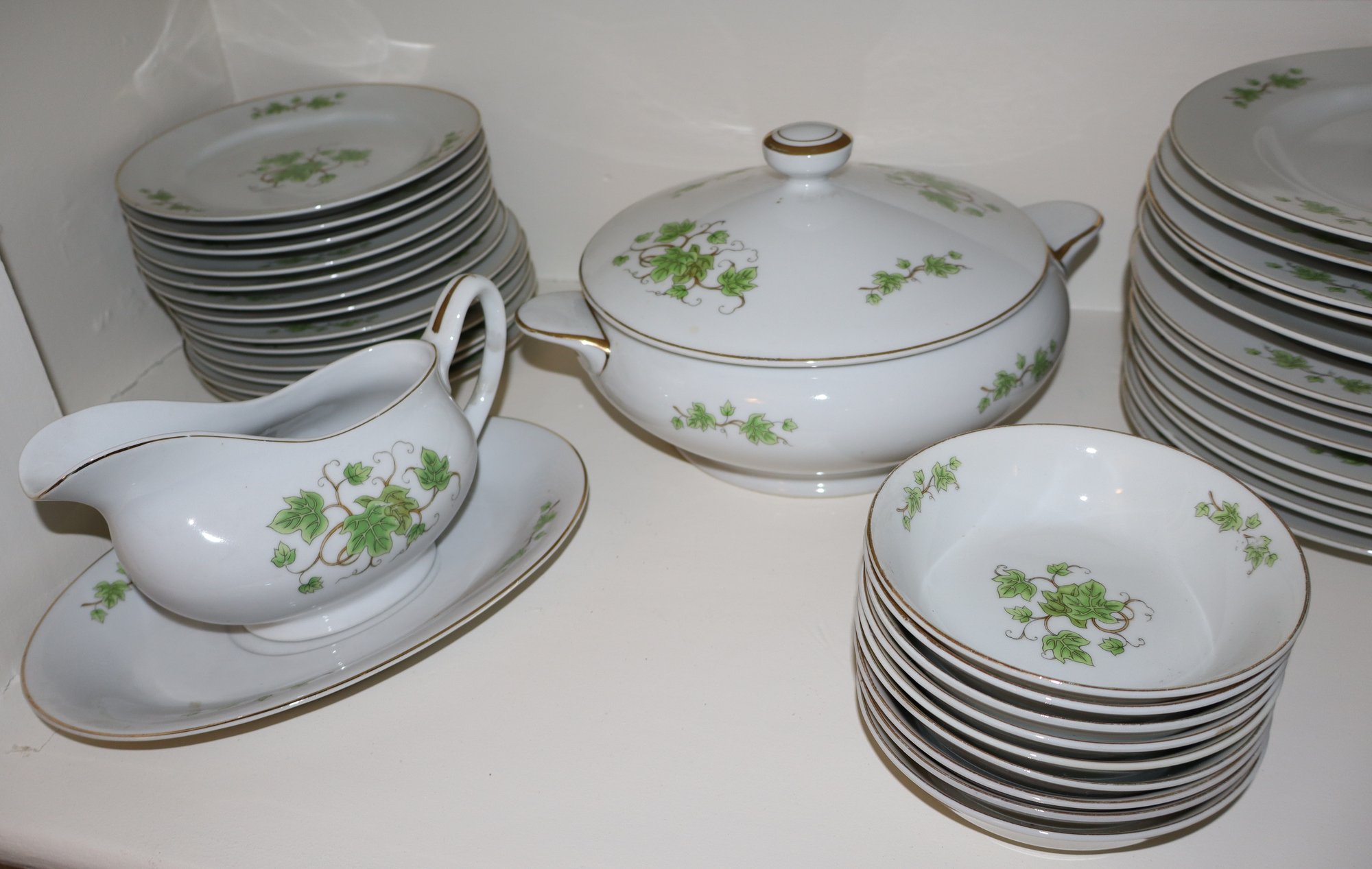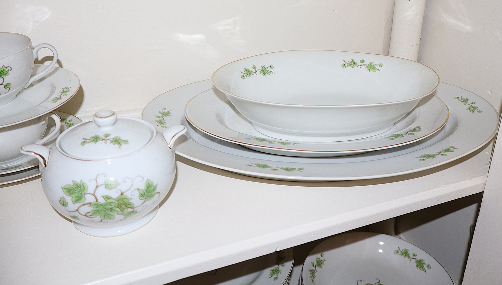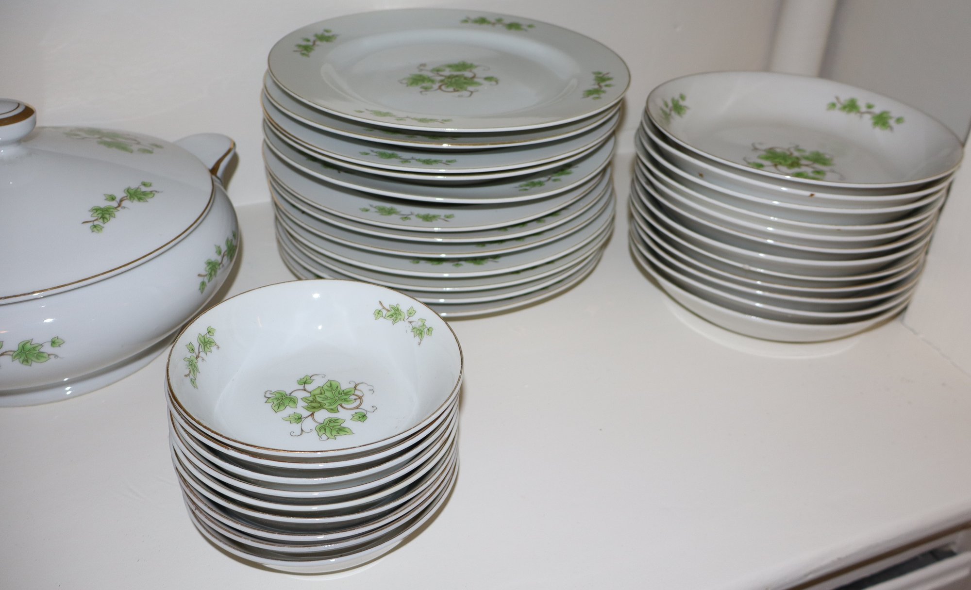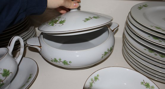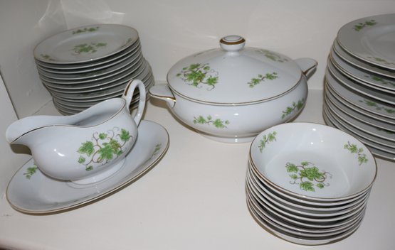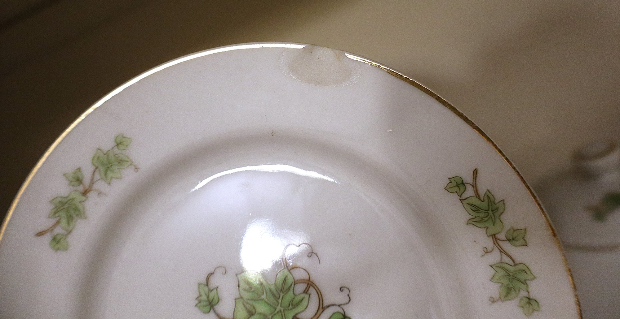 Pattern has a hand painted green ivy leaf on vines with a gold trim