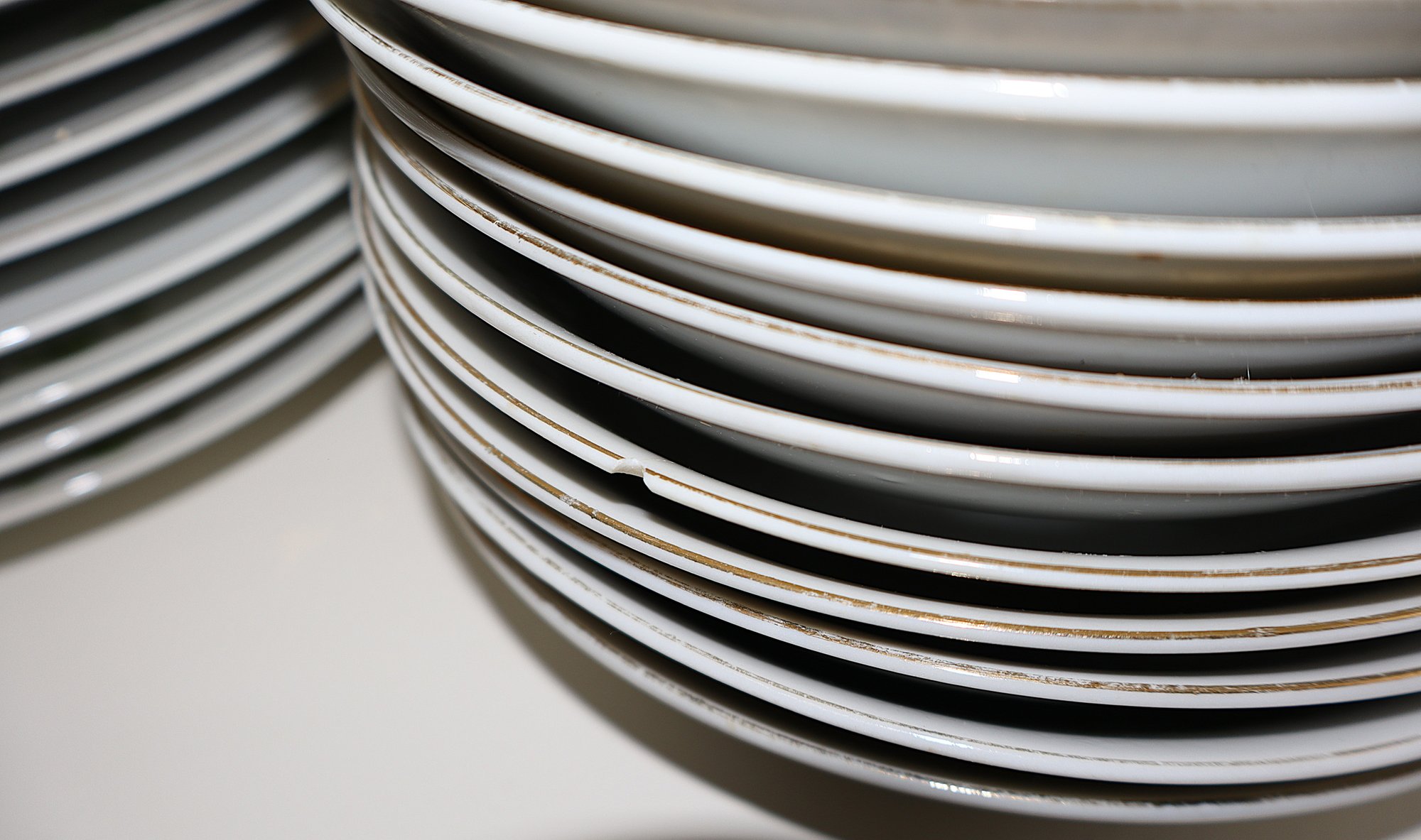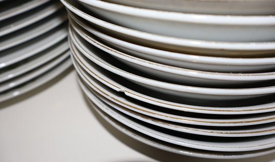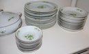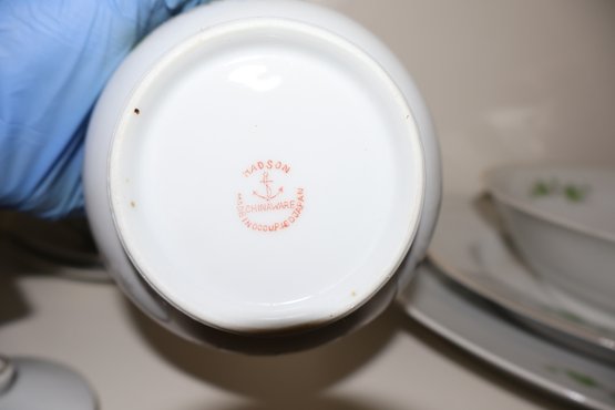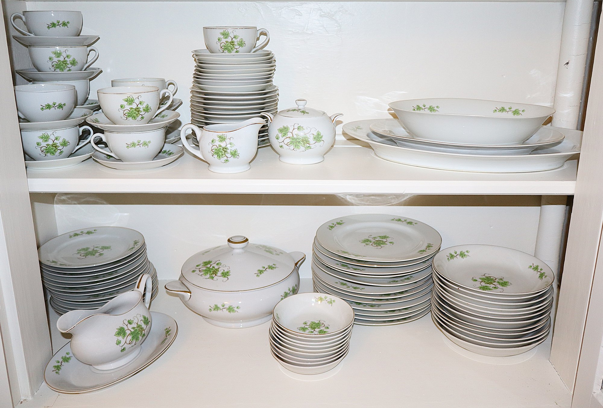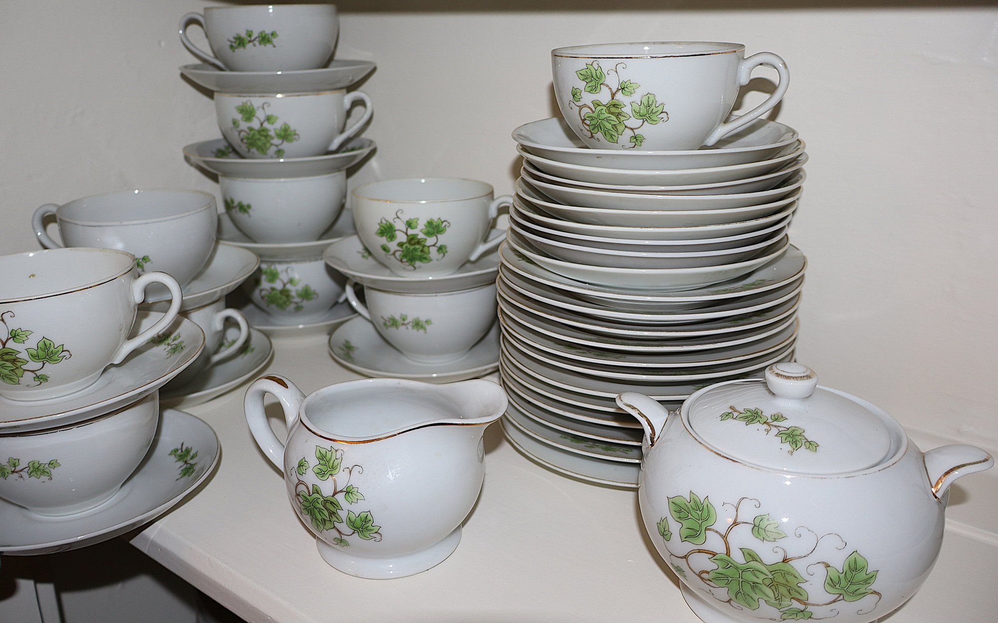 Pattern has a hand painted green ivy leaf on vines with a gold trim