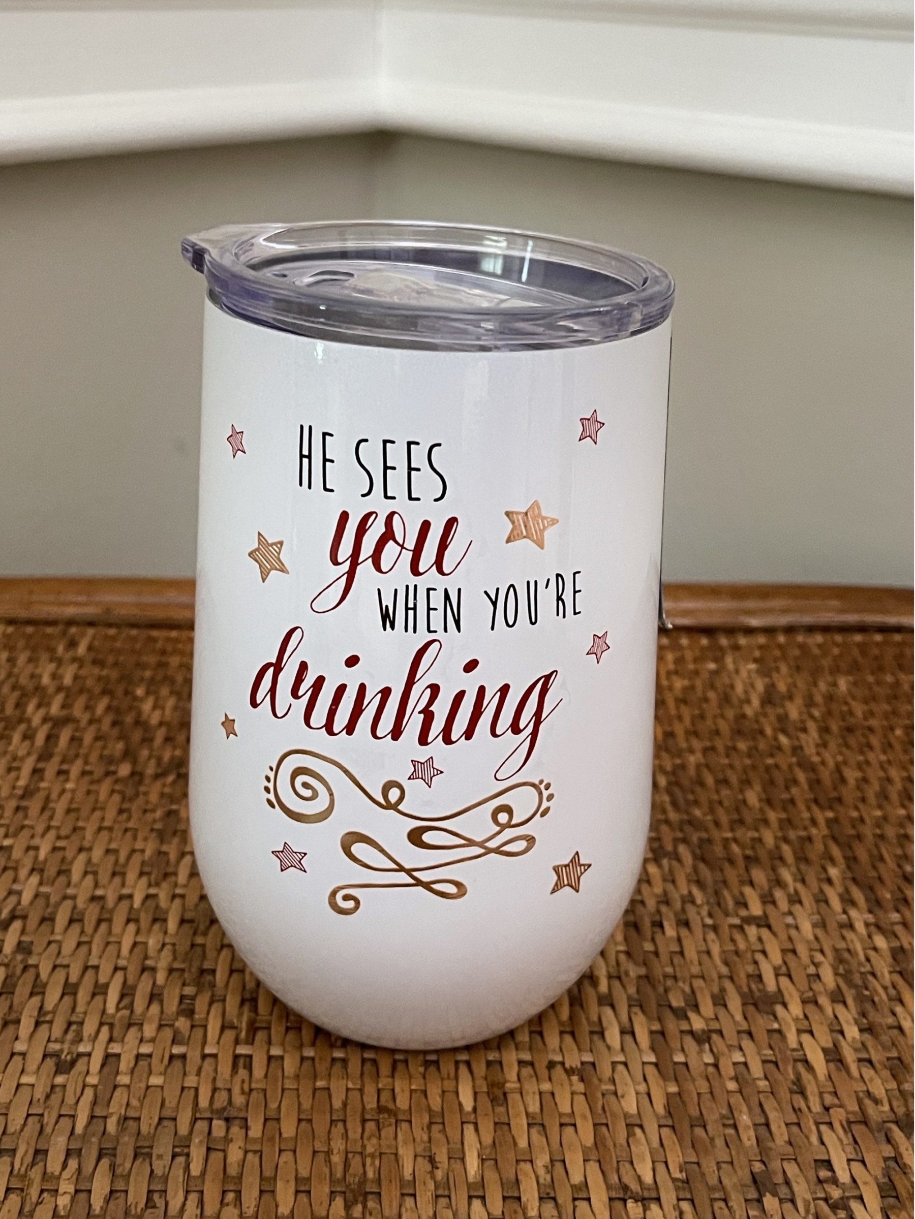 This Cantini double wall vacuum insulated cup has a fun look to it with the saying “He sees you when you’re drinking” - cute! It measures 6 inches tall and holds 16oz of liquid.