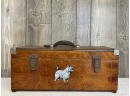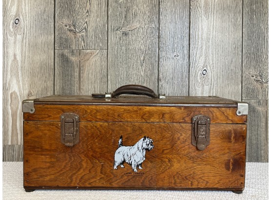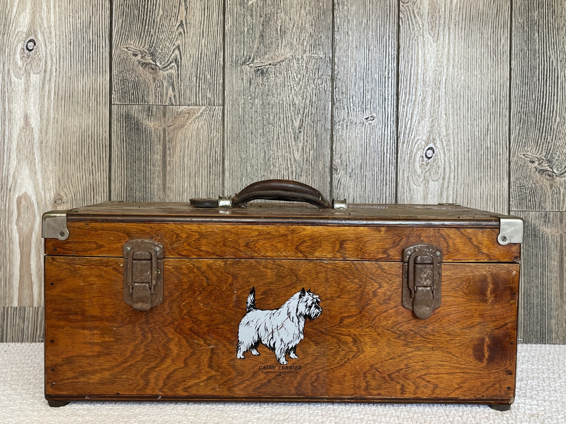 This burl wood tool box has so much character with its grain and golden hues. The front has a white Cairn Terrier and there is a strap handle on top that is broken. 21x9.5x8.5 inches tall.