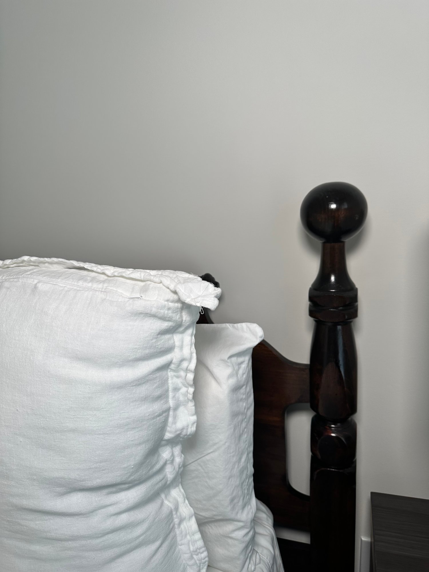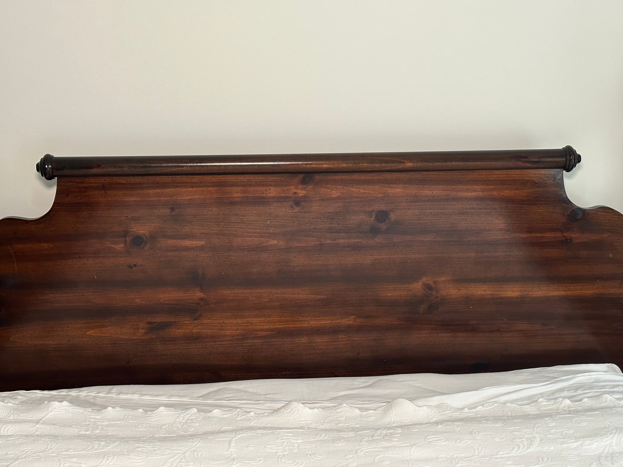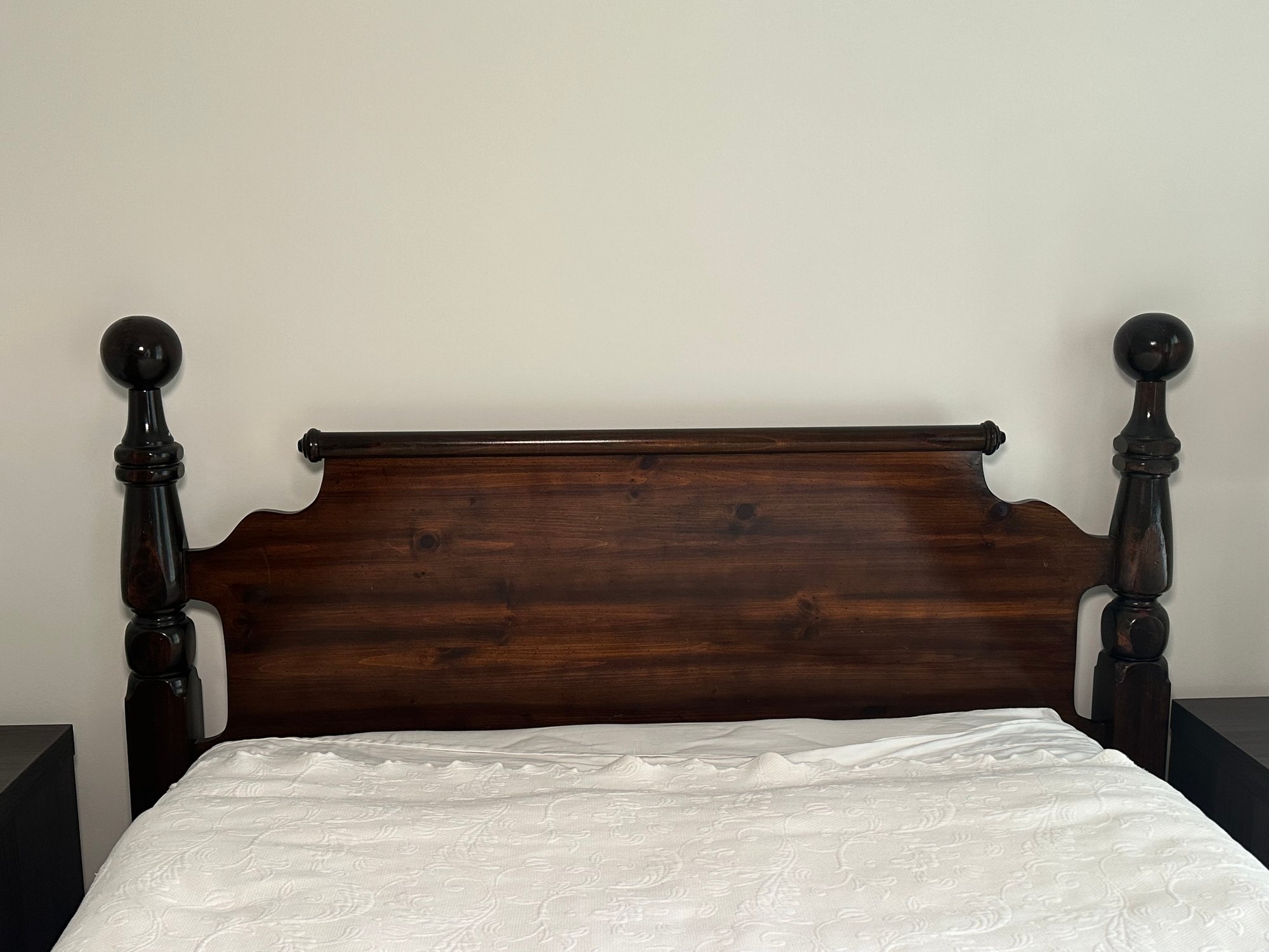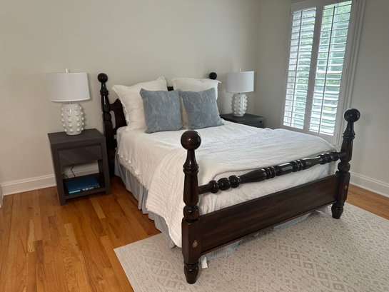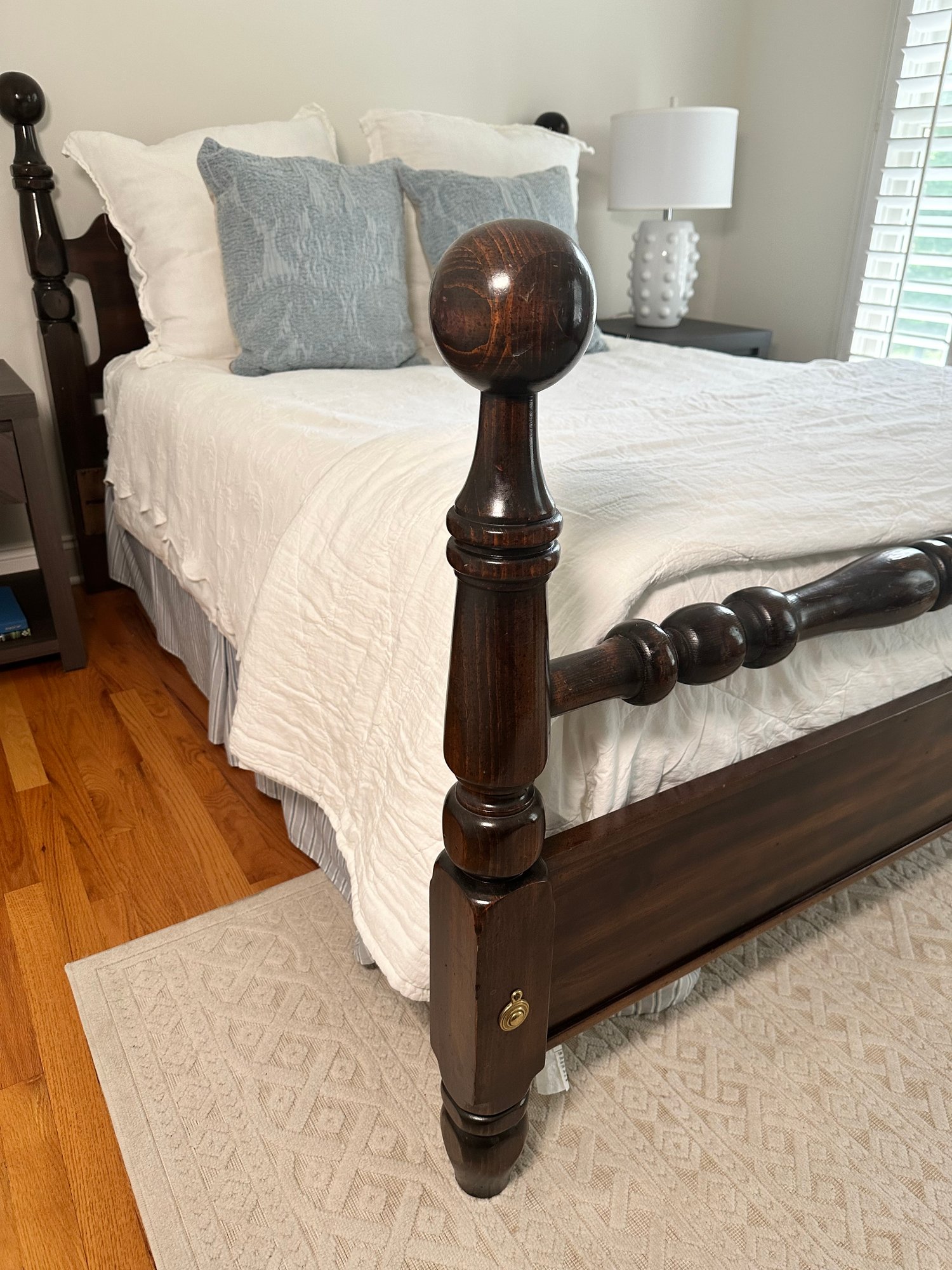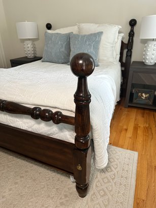 A beautiful vintage cannonball style double bed in a dark mahogany wood. Linens not included. Mattress buyers choice. In very good condition. Purchased at Sheely’s in Pennsylvania.