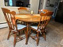 This is a great vintage Tell City Furniture (established in 1865) solid maple table with 4 chairs. The top of this table has been beautifully preserved as you can see in photos. We are blown away by how perfect it is. It comes with two leaves. The table legs are a simple turned leg with beautiful wood grain. The chairs have spindle back with nice character, some edge wear in places only adding to its character. If you are looking for a solid kitchen table, we recommend this one. There are plastic sliders on the chair feet that can be removed. This is style “F8163Y”