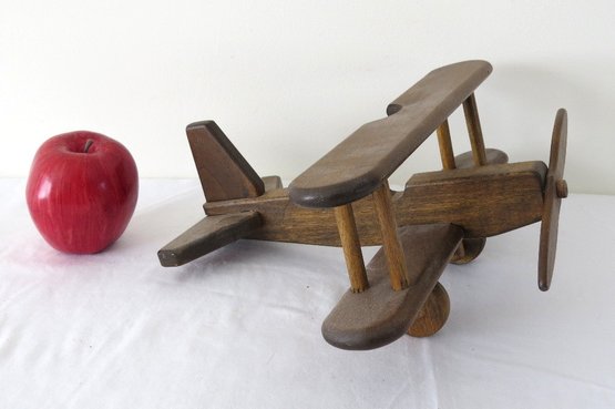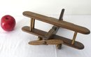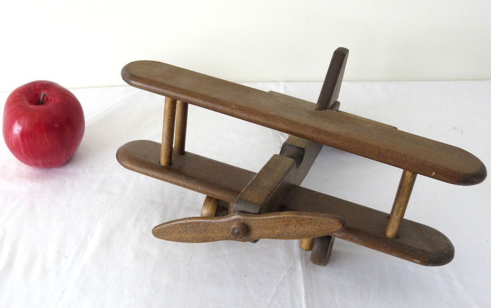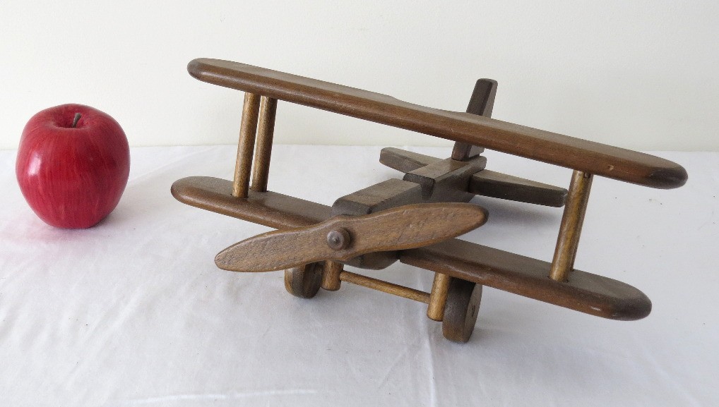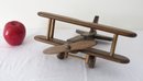 Carved wooden model World War 1 style biplane with functional propeller and wheels.