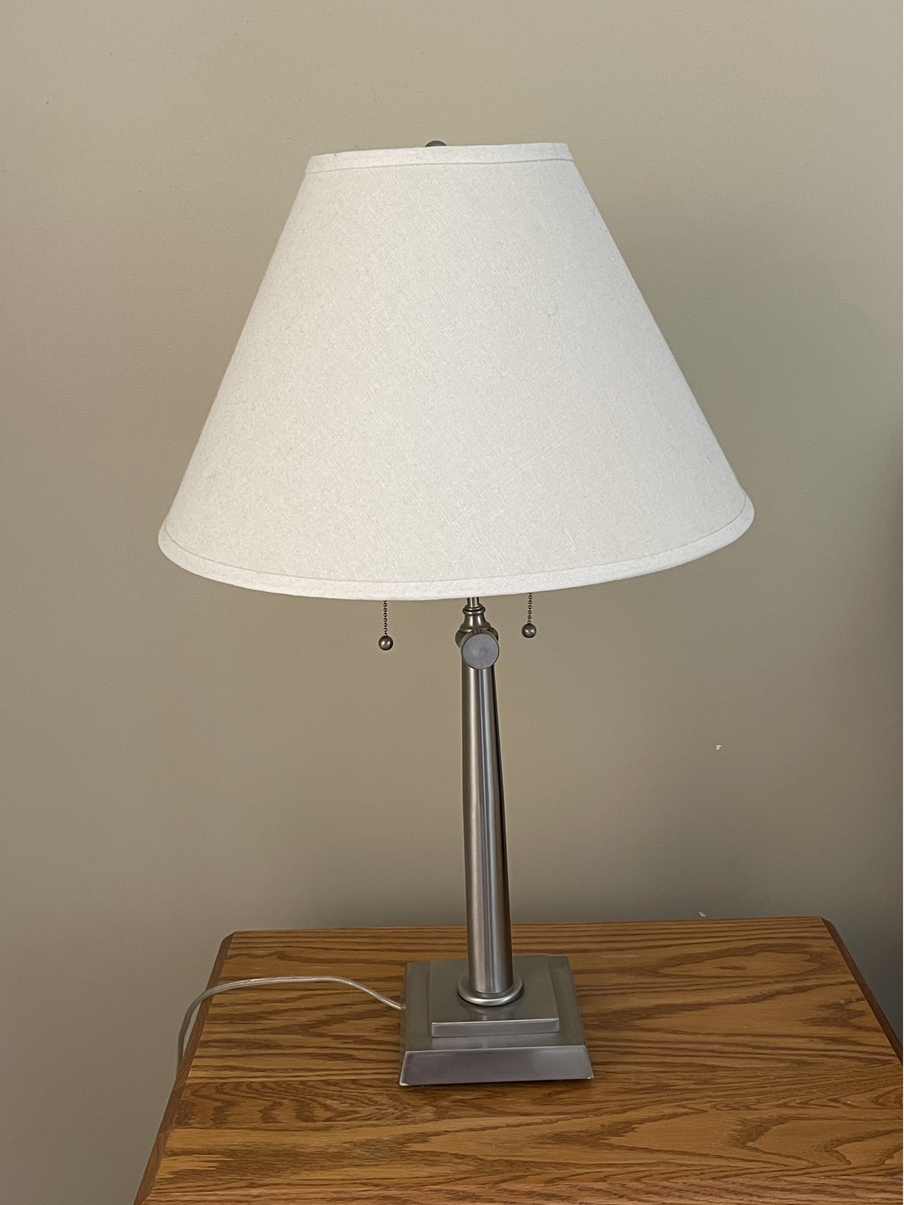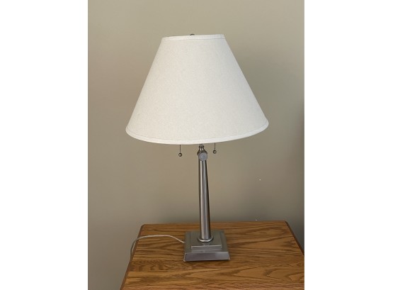 A Chrome Pull String Table Lamp With a white lamp shade. It measures 30 inches tall with a base that has a 6.5 inch square. There is a matching lamp in next lot.