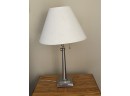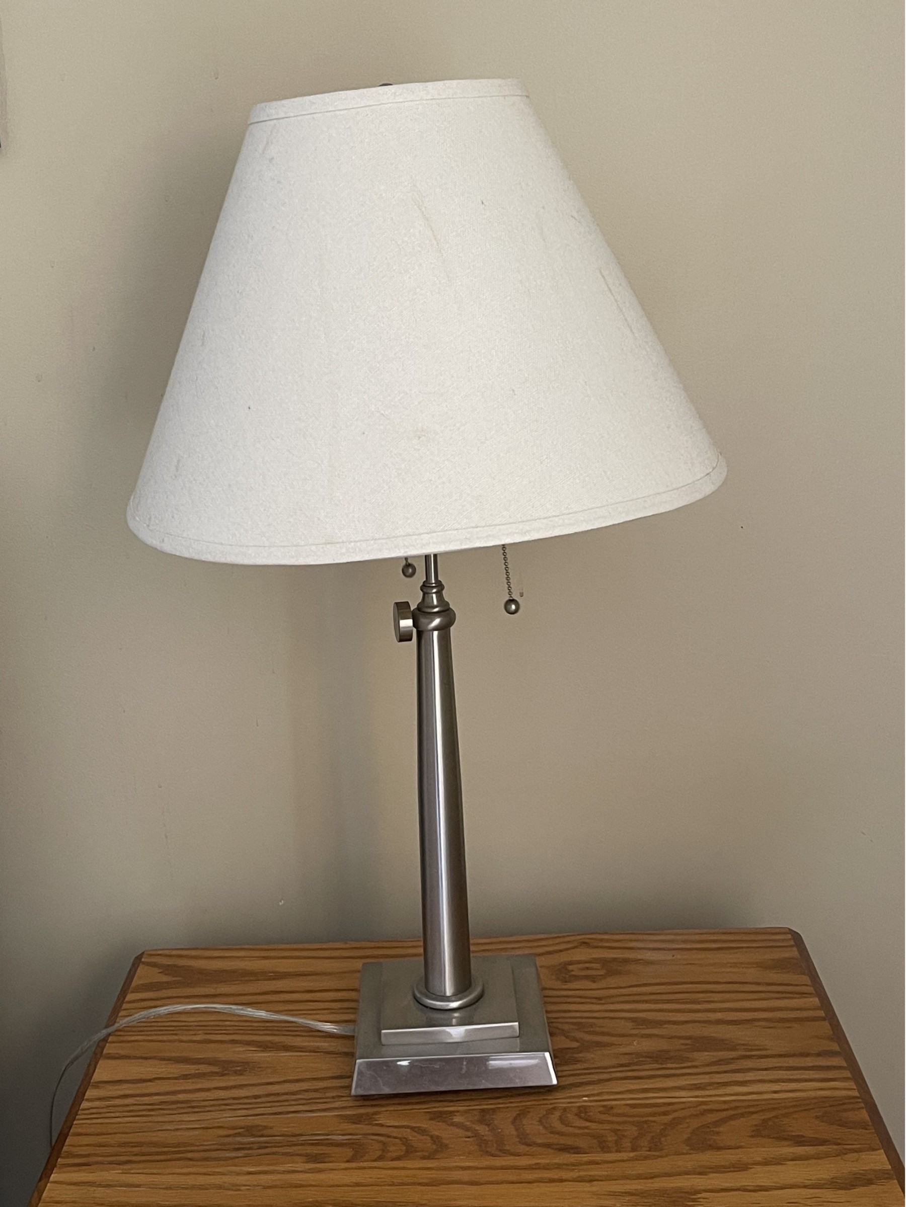 A Chrome Pull String Table Lamp With a white lamp shade. Please note, the lamp shade has stains on it. See photos. It measures 30 inches tall with a base that has a 6.5 inch square. There is a matching lamp in next lot.