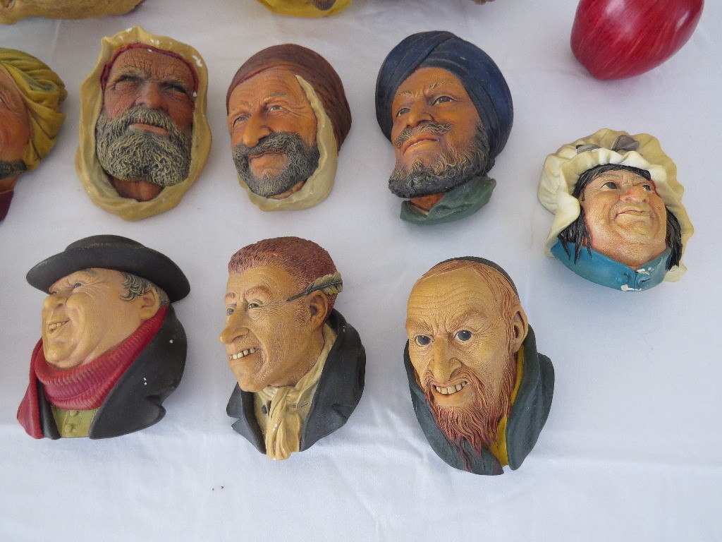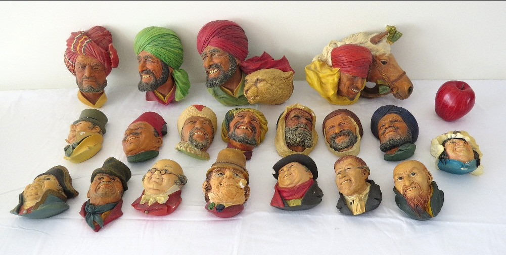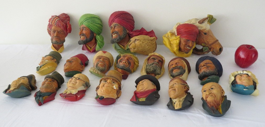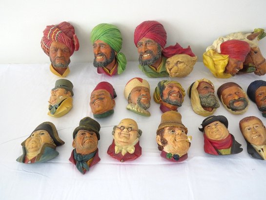 A grouping of 19 English Chalkware Bosson's including Dickens characters, Turkish / Indian characters and more. Minor nicks/chips on some but not all.