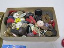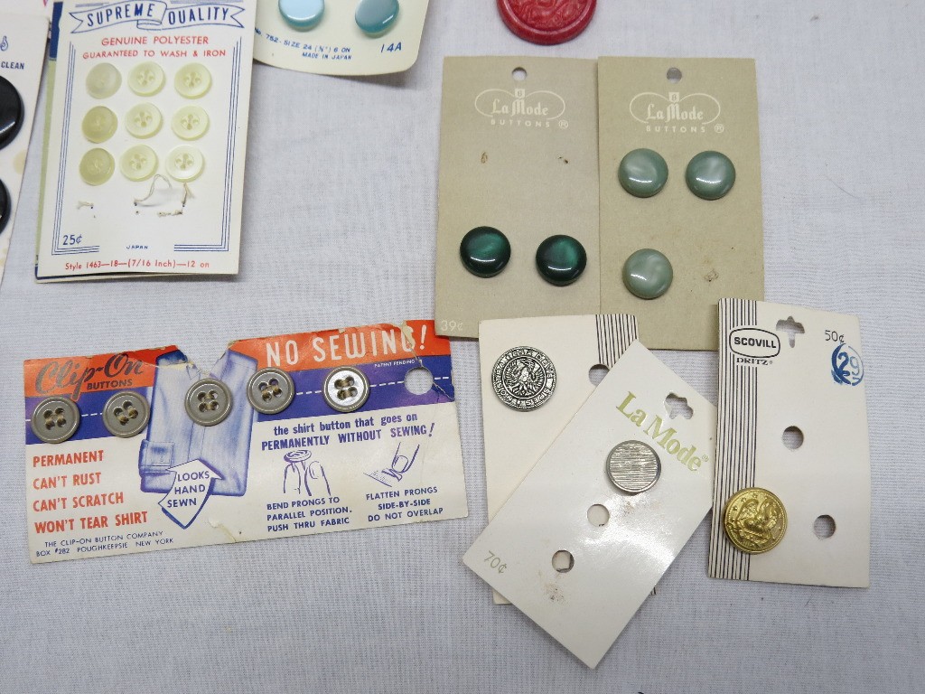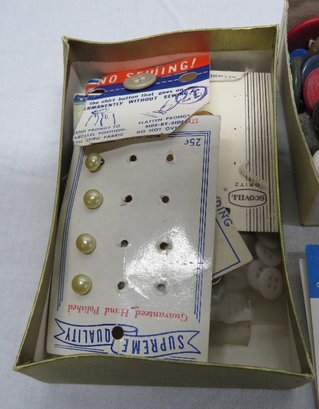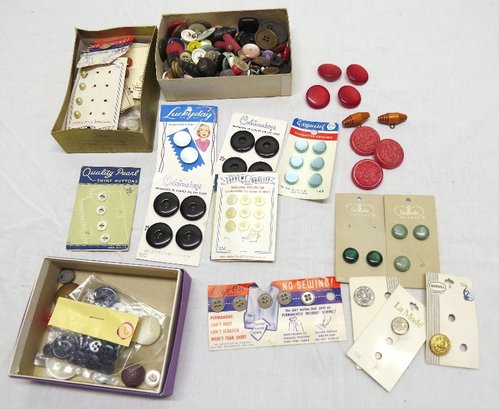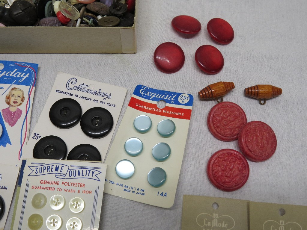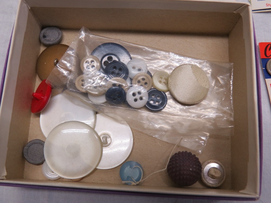 Three small boxes of buttons, some on cards, some appear to be bakelite, mid-century, etc.