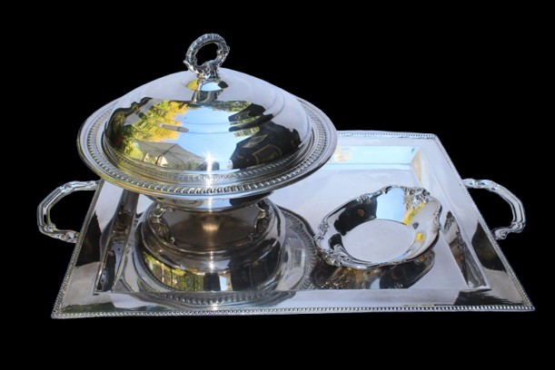 Footed Lidded Silver-Plated Serving Dish/ covered Casserole with Pyrex insert bowl & small ornate vintage silver plate relish dish