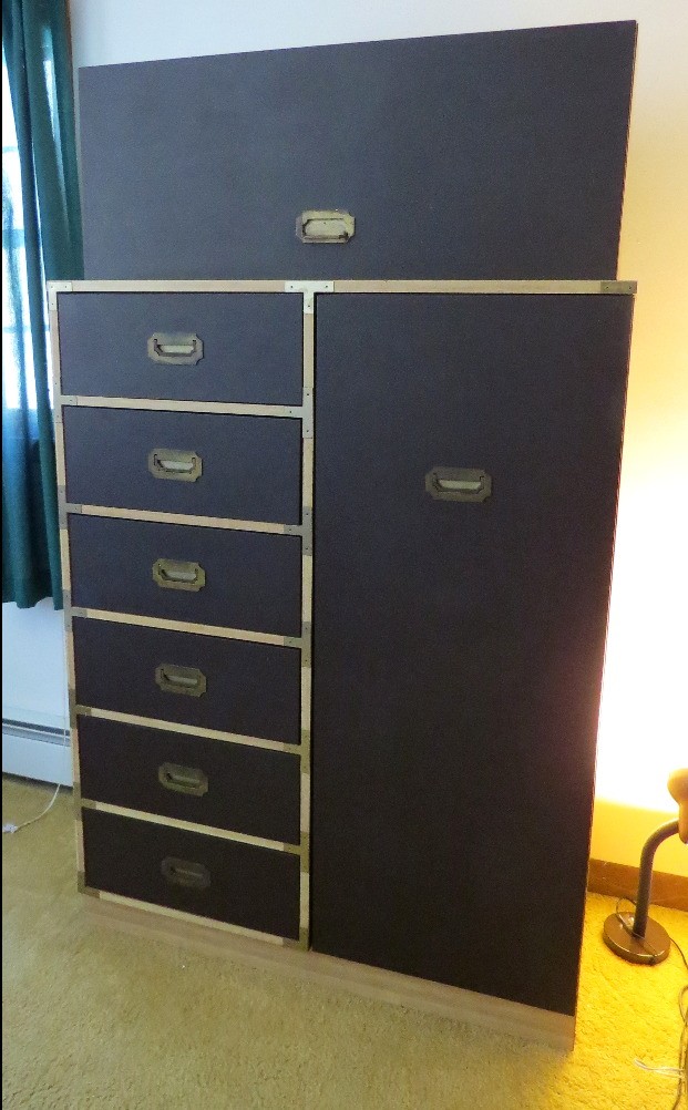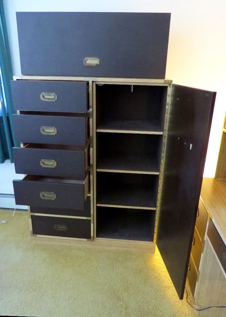 A vintage bedroom set consisting of large 6 drawer, one door closet wardrobe that goes with 2 bunk beds. Currently spread about the house in various rooms so we couldn't photograph it all together.