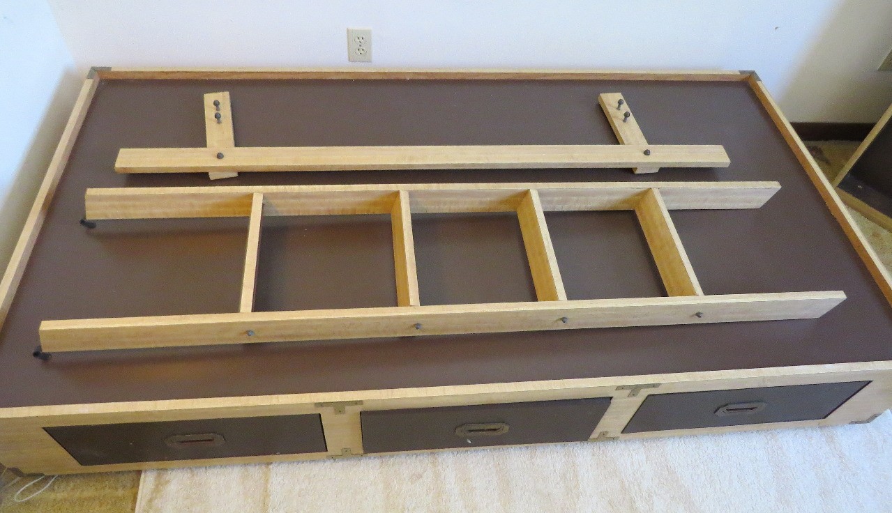 The bunkbed has 3 built in storage drawers in the base unit, 78" long, 41" wide, 20" in height. Upper bed frame attaches to the large backboard we pictured in the garage on one end, and the wardrobe on the other, ladder and top safety rail also present.