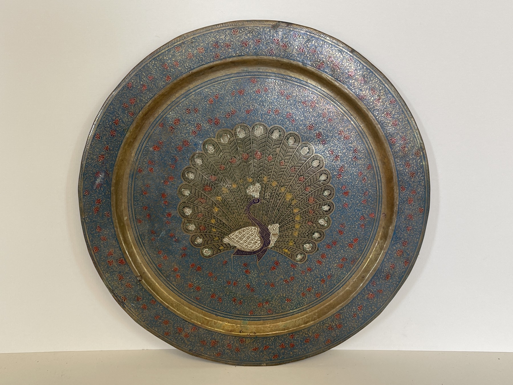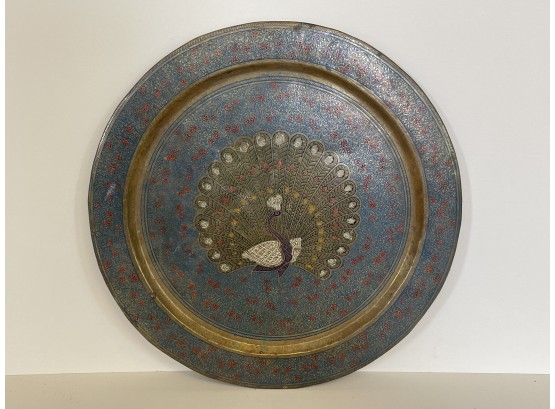 Check out the brass color against the blues and red. There is a hanger on back to put up onto your wall. Approx 13 inches in diameter.