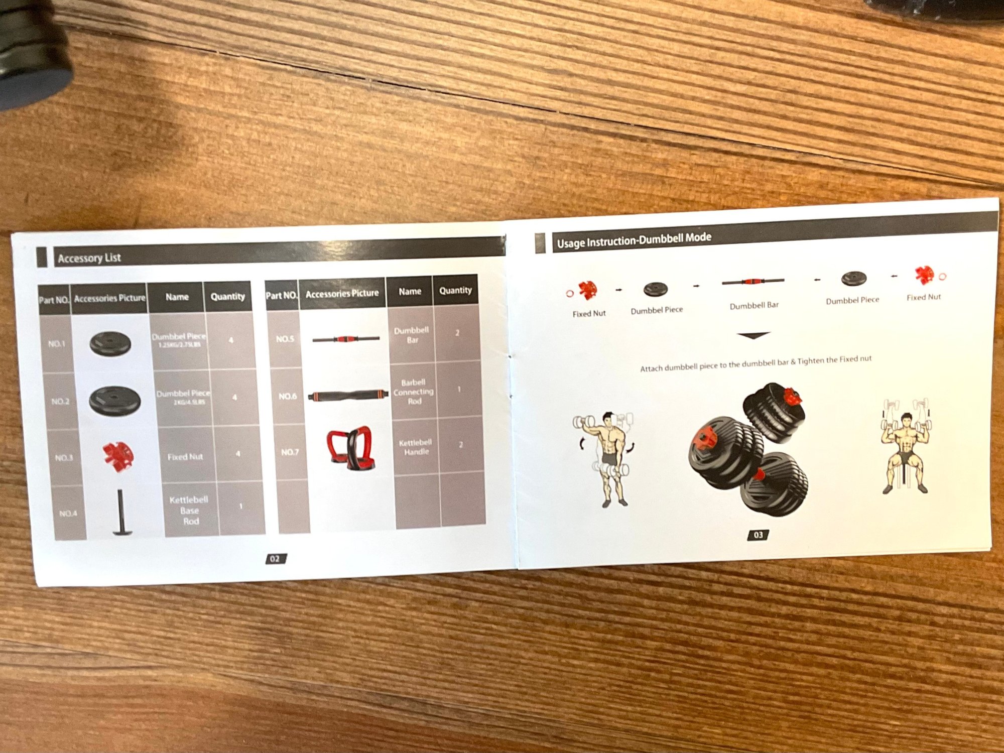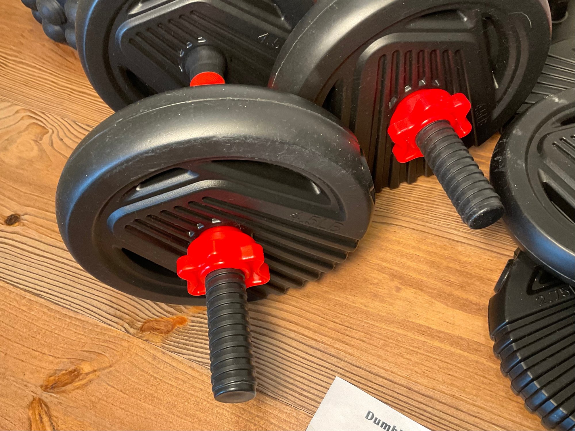 Interchangeable weights and bars make for a compact home gym - system Includes weights, clamps bars, as shown, plus a FitBeast back roller wheel (diameter 8 1/2 x 7”H), anda pair of 3 pound dumbbells (not shown).