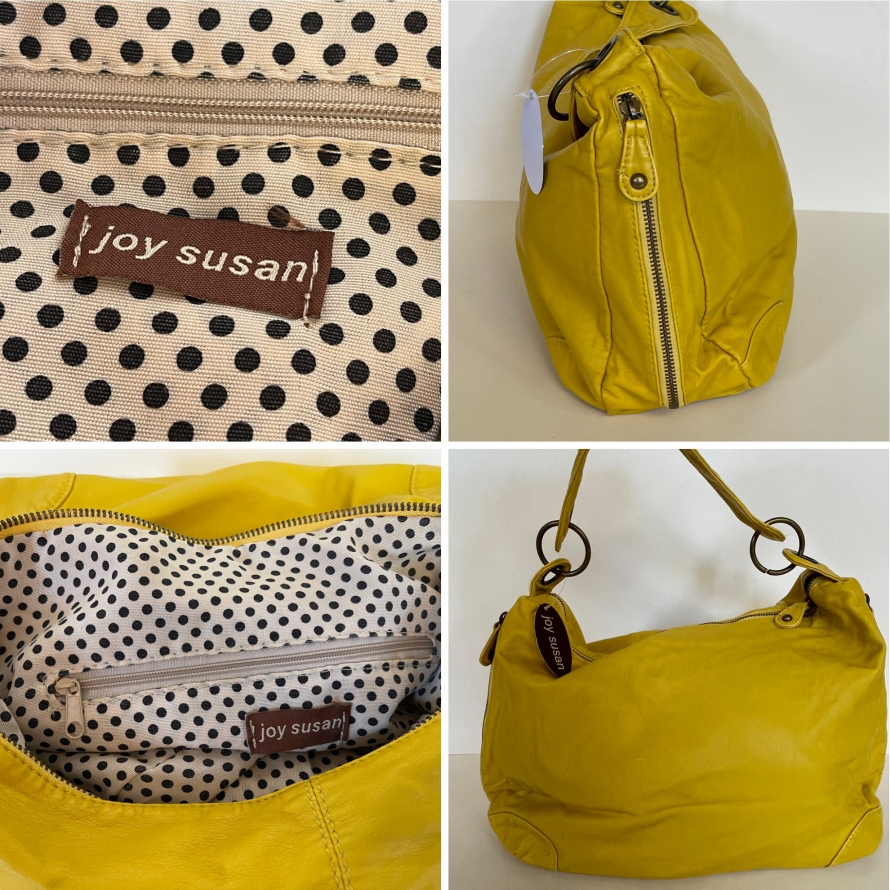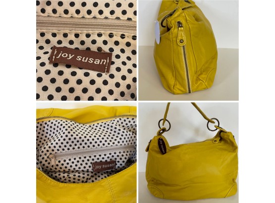 A Fantastic Never Used Joy Susan Yellow Purse With beige liner with black polka dots. There is a zipper pocket inside as well as two pockets. Both sides also unzip for additional storage space! Made with 100 percent polyester.