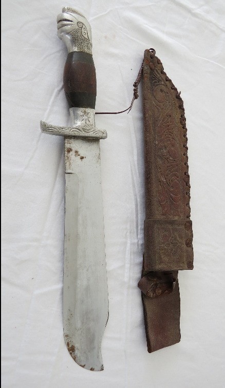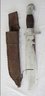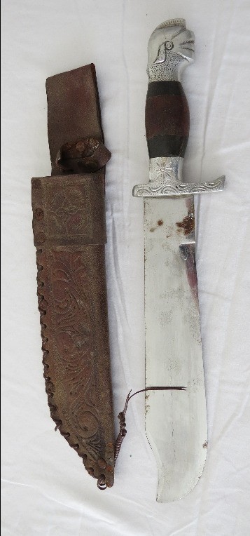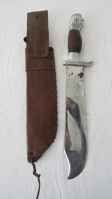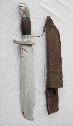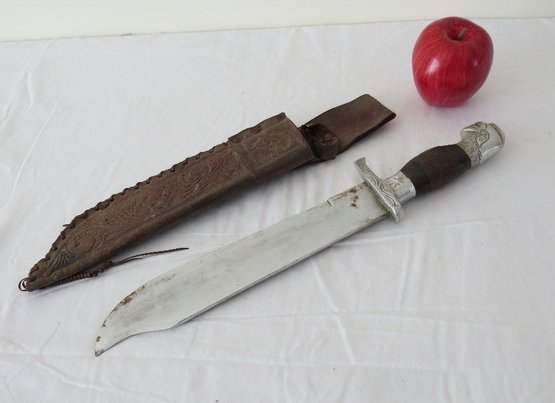 A fixed blade dagger / knife with eagle head pommel and leather sheath. Blade is 10.25" long.