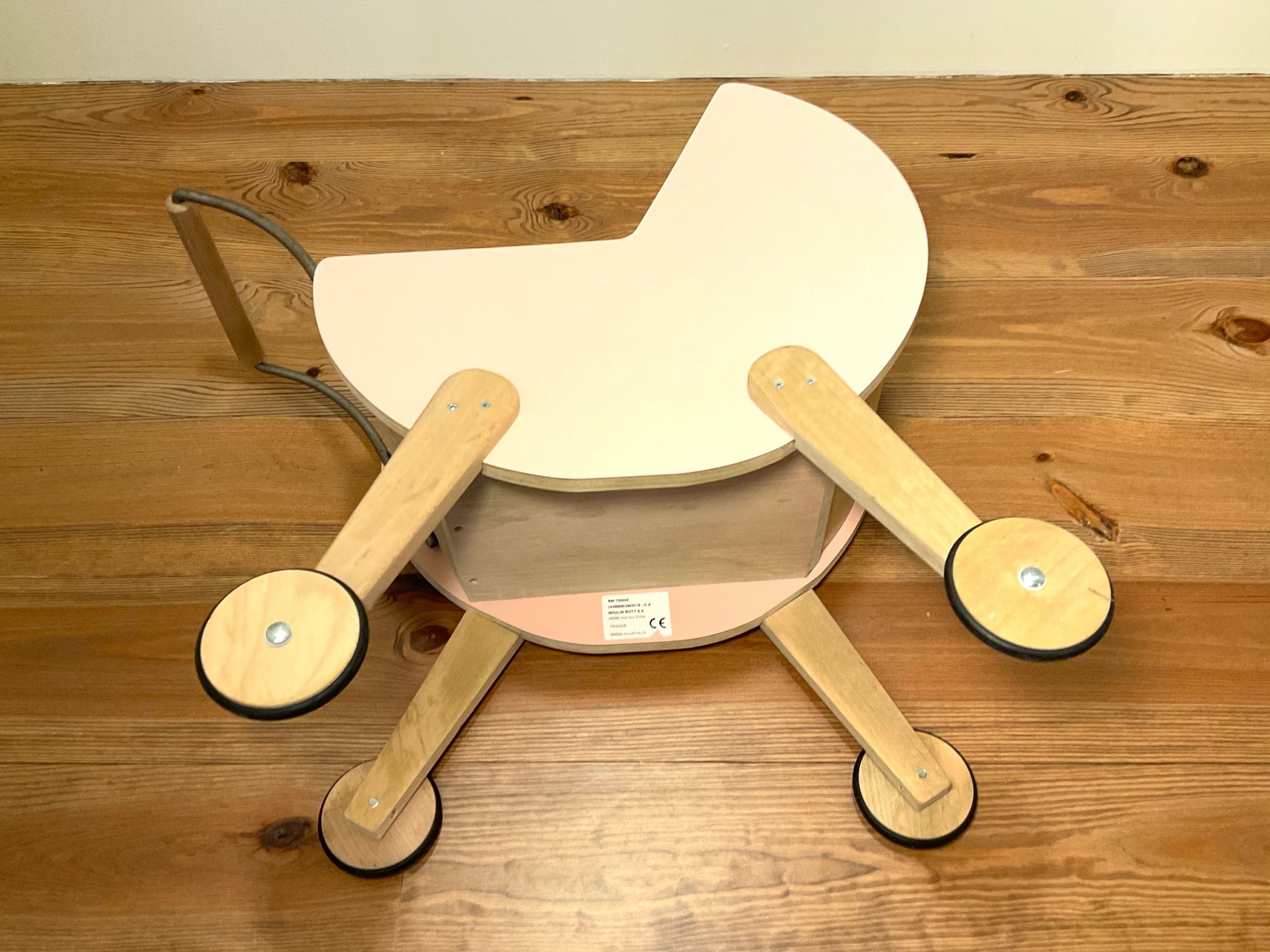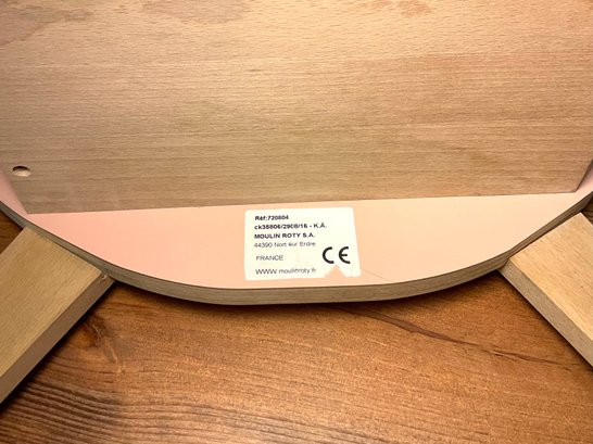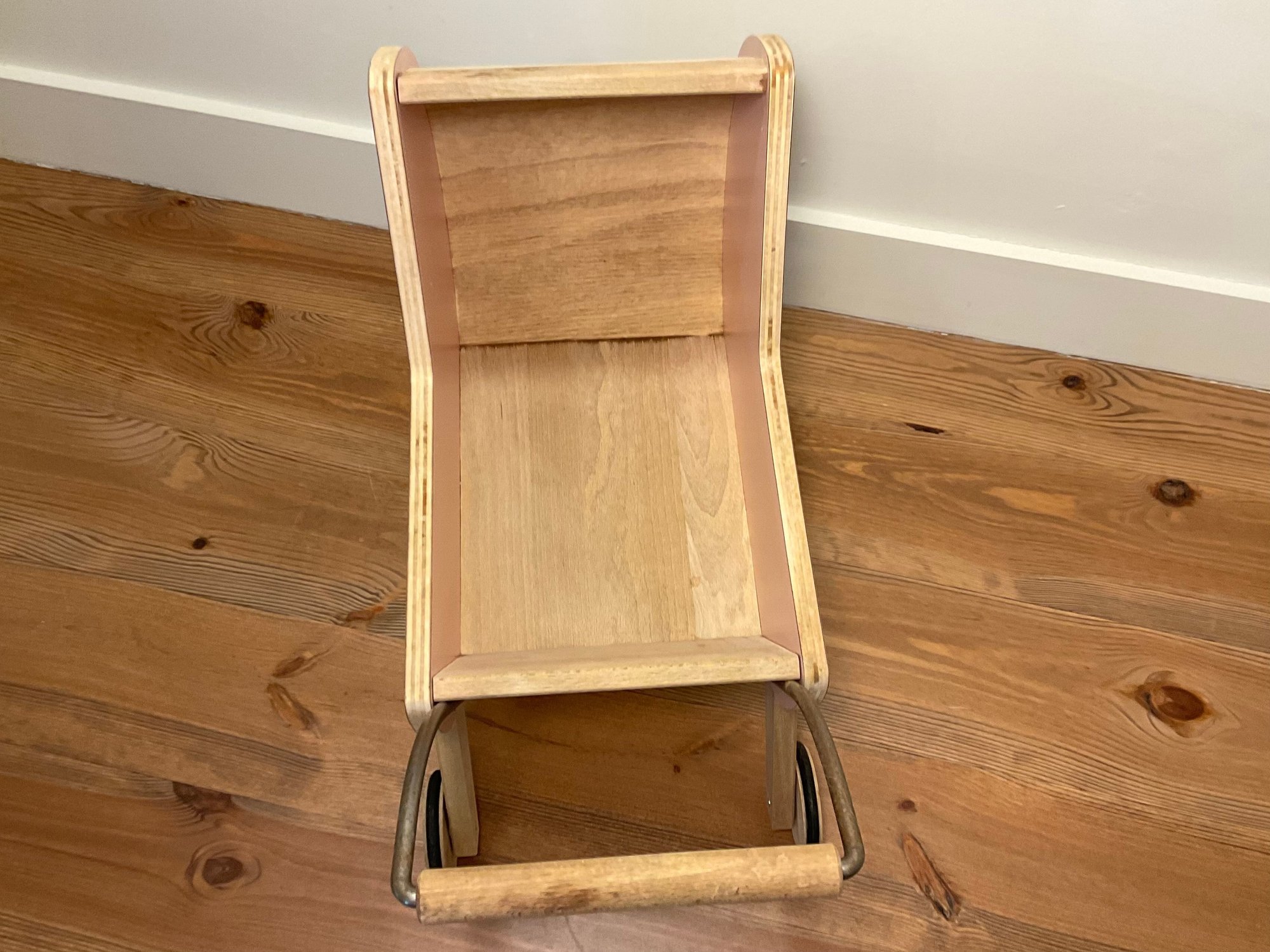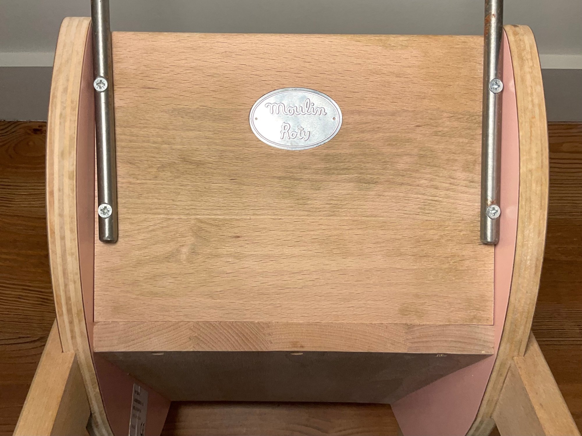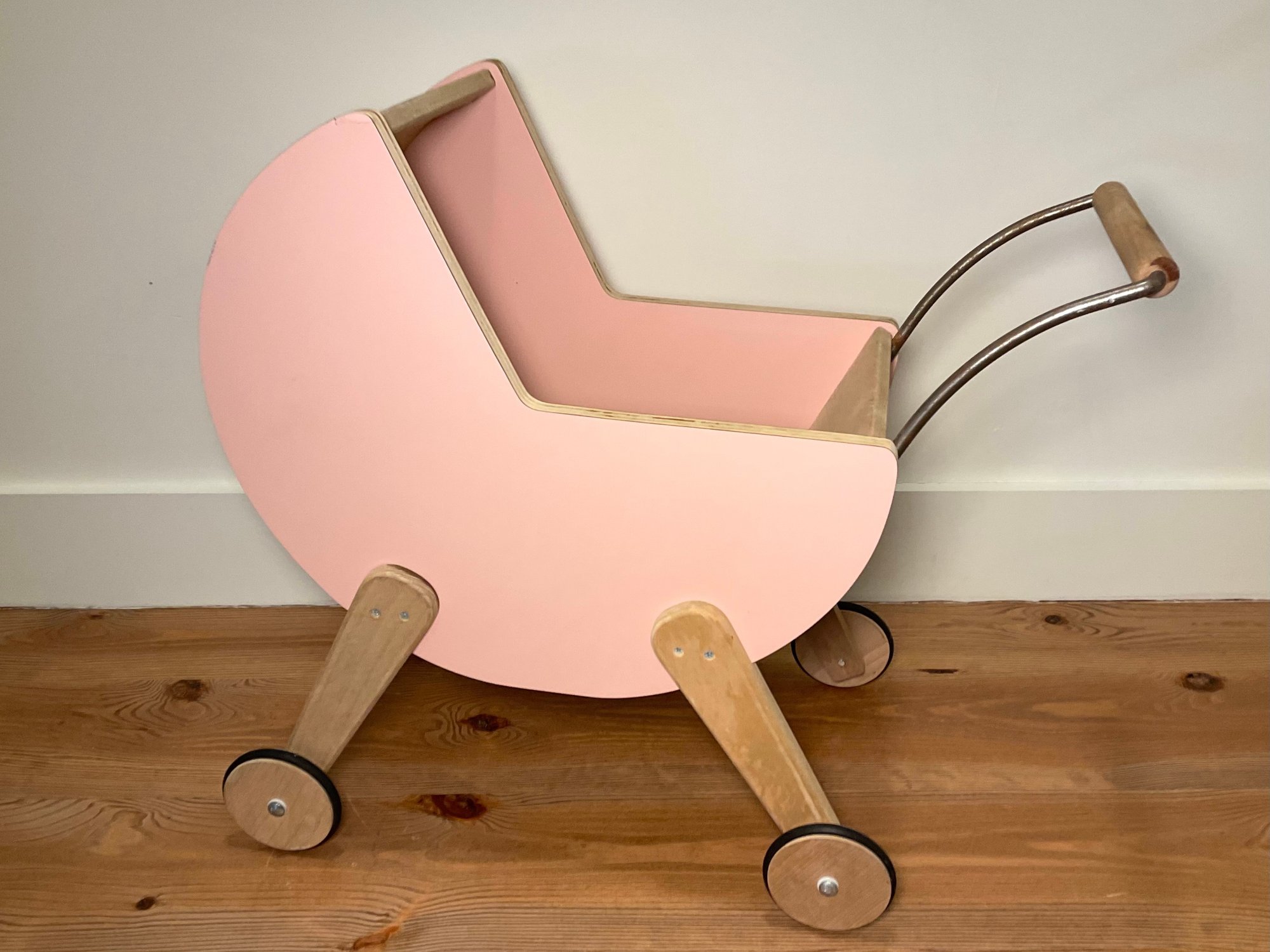 Oh so sweet! Beechwood and pink formica, vintage style doll’s pram marked Moulin Roty, made in France.