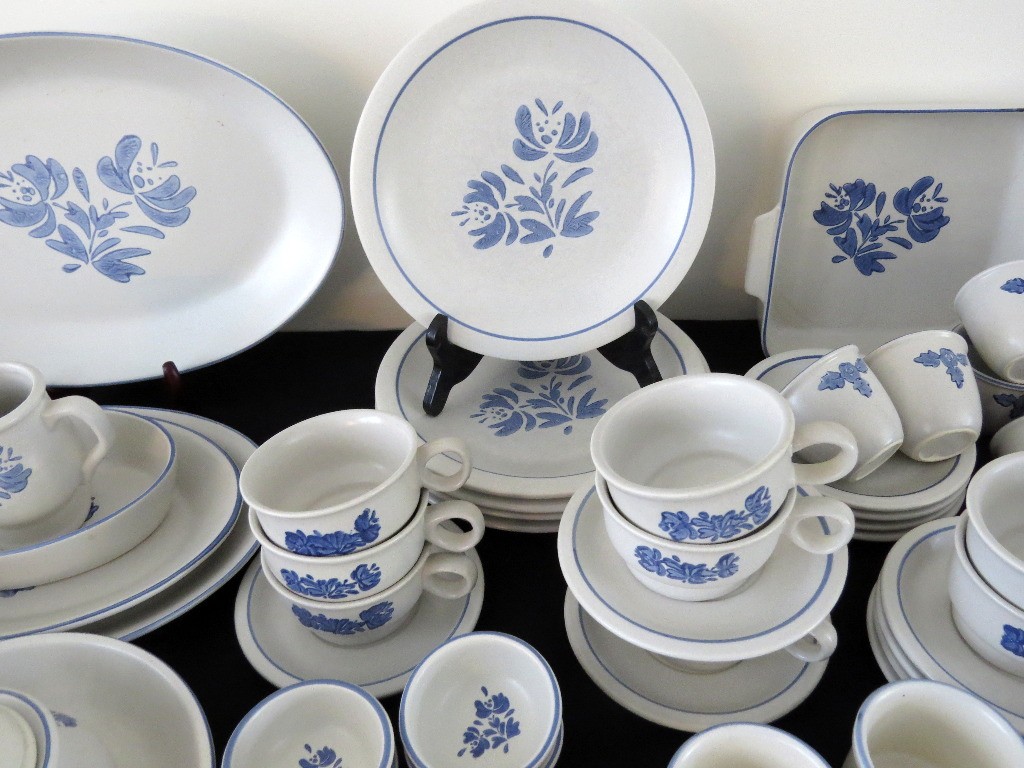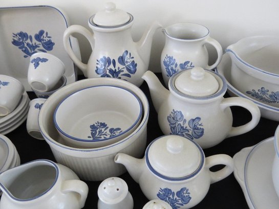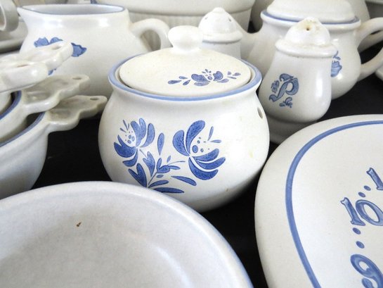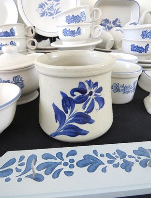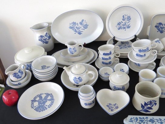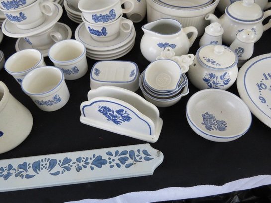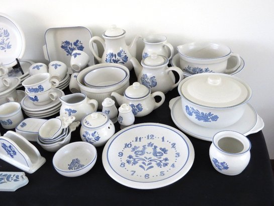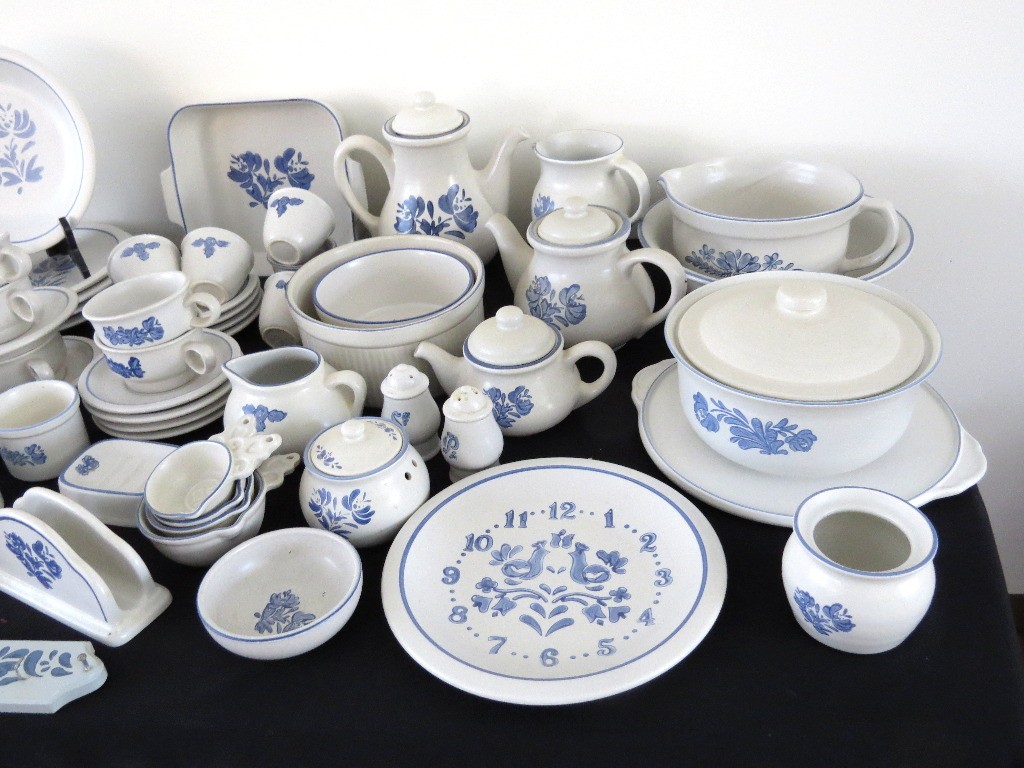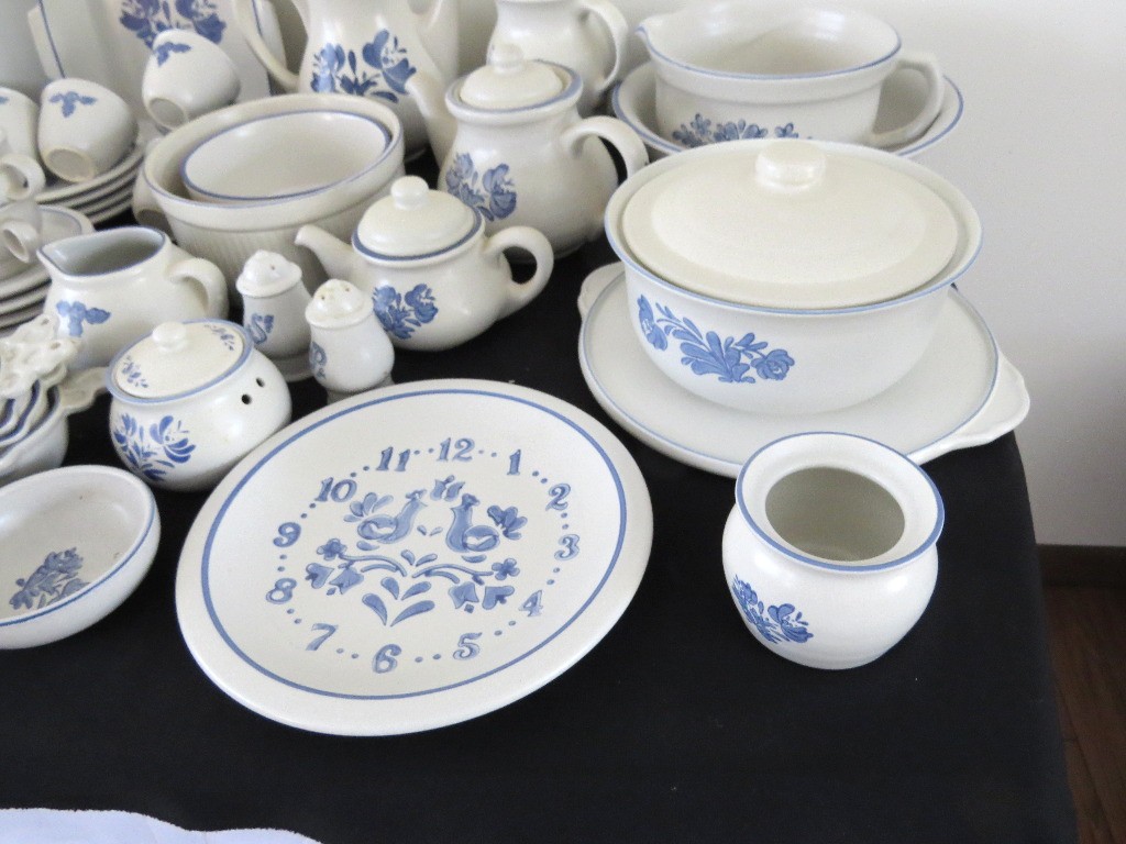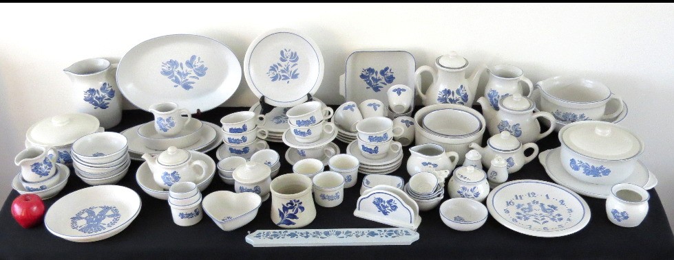 A huge assortment of Pfaltzgraff Yorktowne grey & blue pattern stoneware, some tough to find pieces in here the garlic jar, measuring cups, batter bowl and more. Many serving pieces as well as everyday dining. Of everything there only the 4pcs on the far left we found with any chipping, including the lid to the covered vegetable bowl, cereal bowl, salad plate and a small pitcher. There is one piece in the center that looks like a utensil crock which is not Pfaltzgraff, but it matches so closely it is part of this lot. A dealers delight!