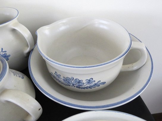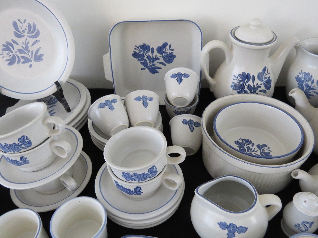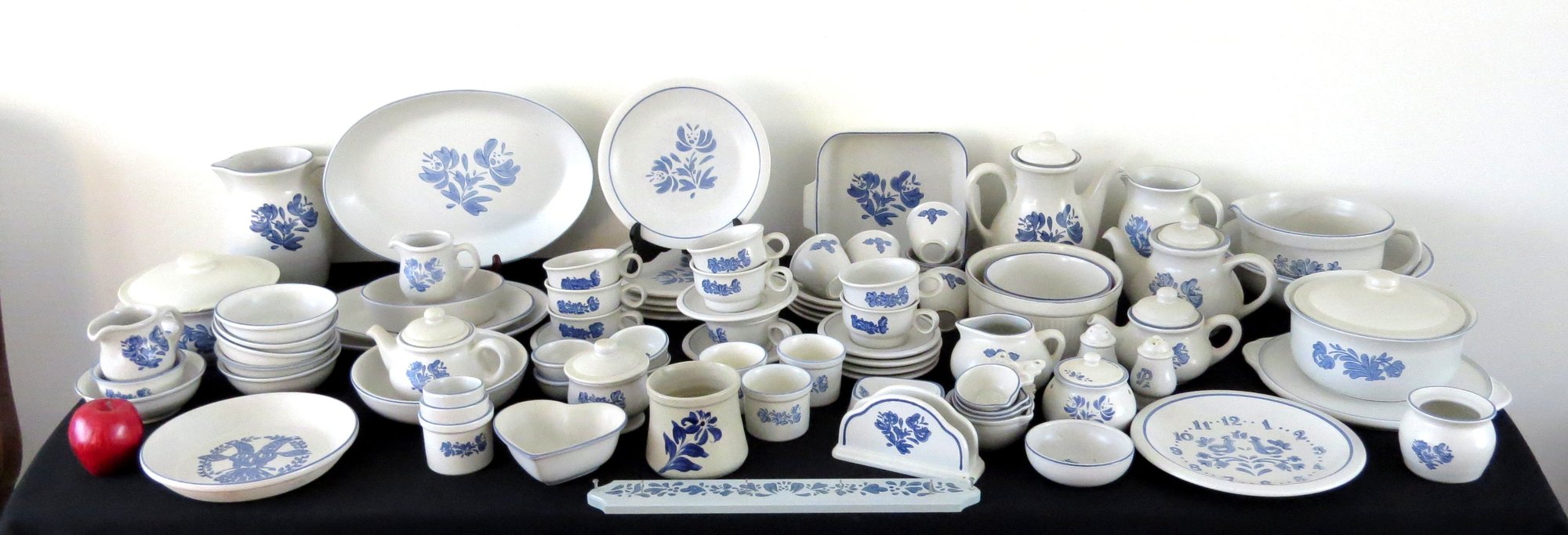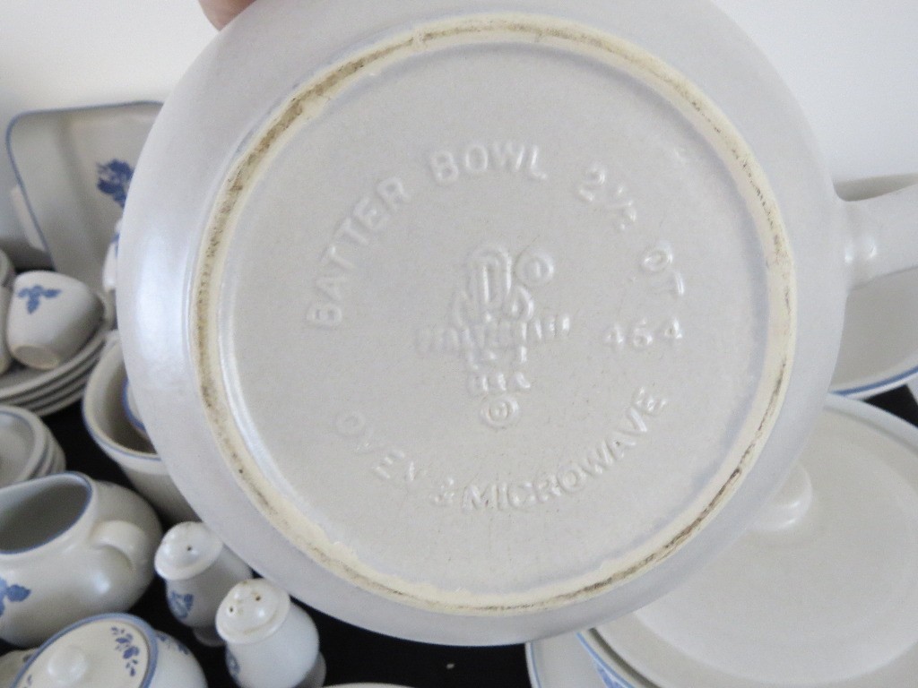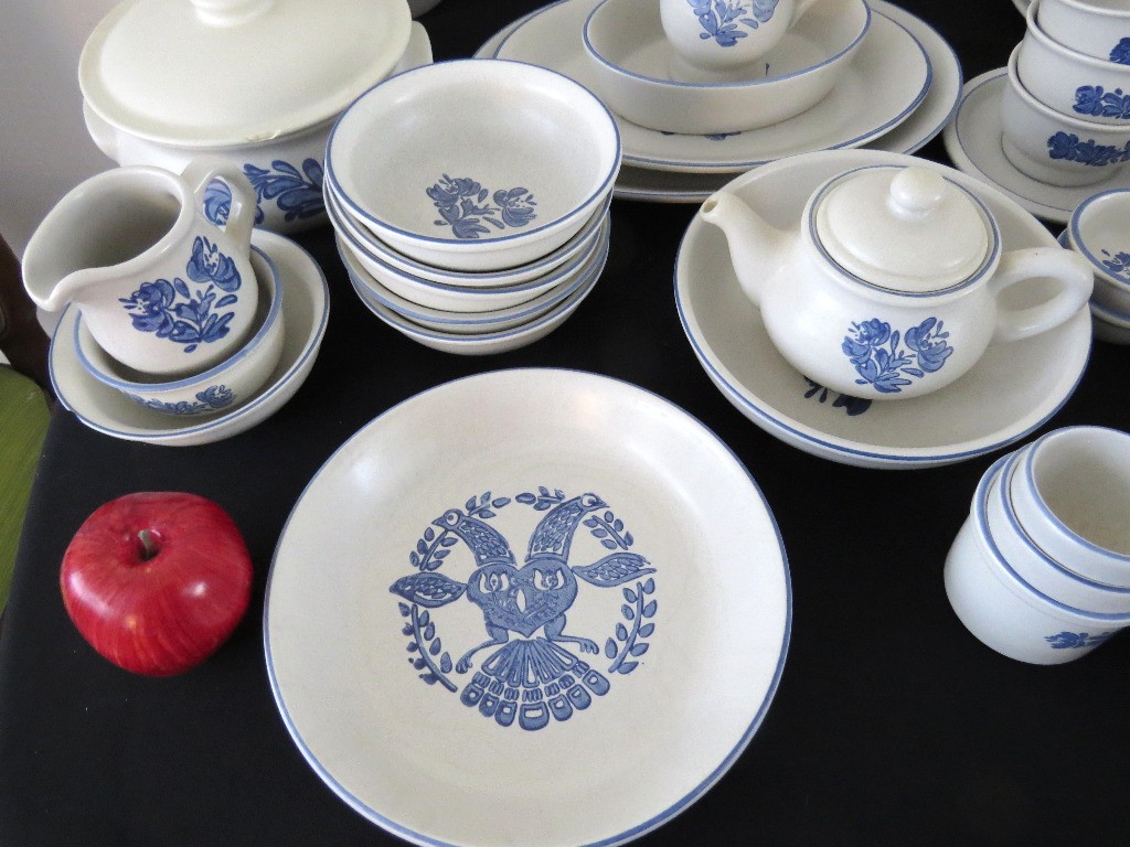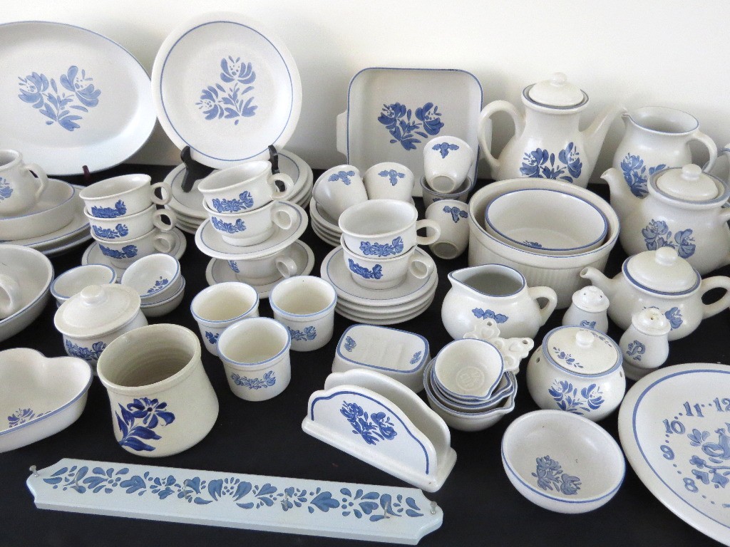 A huge assortment of Pfaltzgraff Yorktowne grey & blue pattern stoneware, some tough to find pieces in here the garlic jar, measuring cups, batter bowl and more. Many serving pieces as well as everyday dining. Of everything there only the 4pcs on the far left we found with any chipping, including the lid to the covered vegetable bowl, cereal bowl, salad plate and a small pitcher. There is one piece in the center that looks like a utensil crock which is not Pfaltzgraff, but it matches so closely it is part of this lot. A dealers delight!