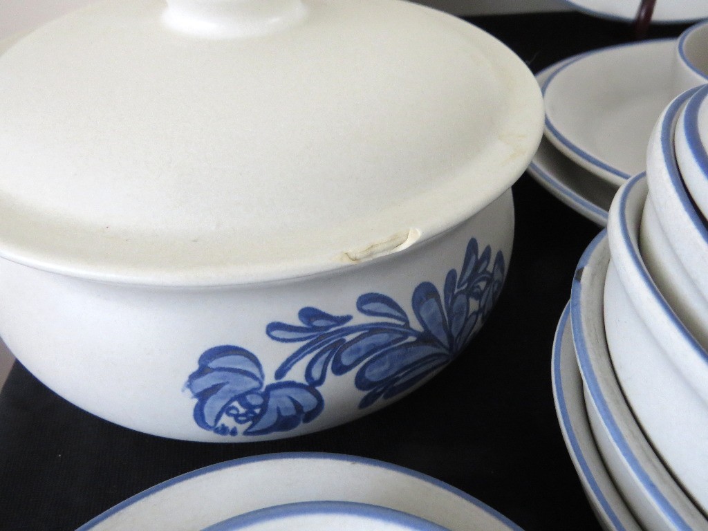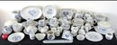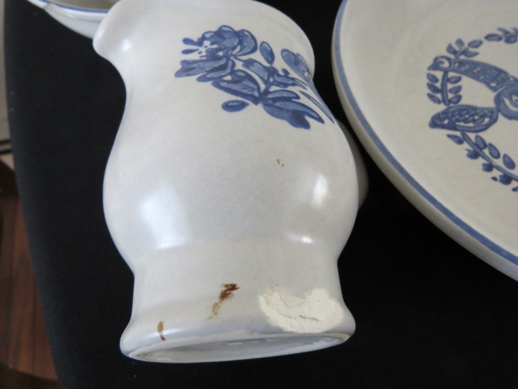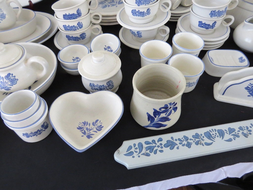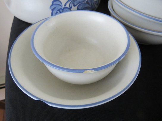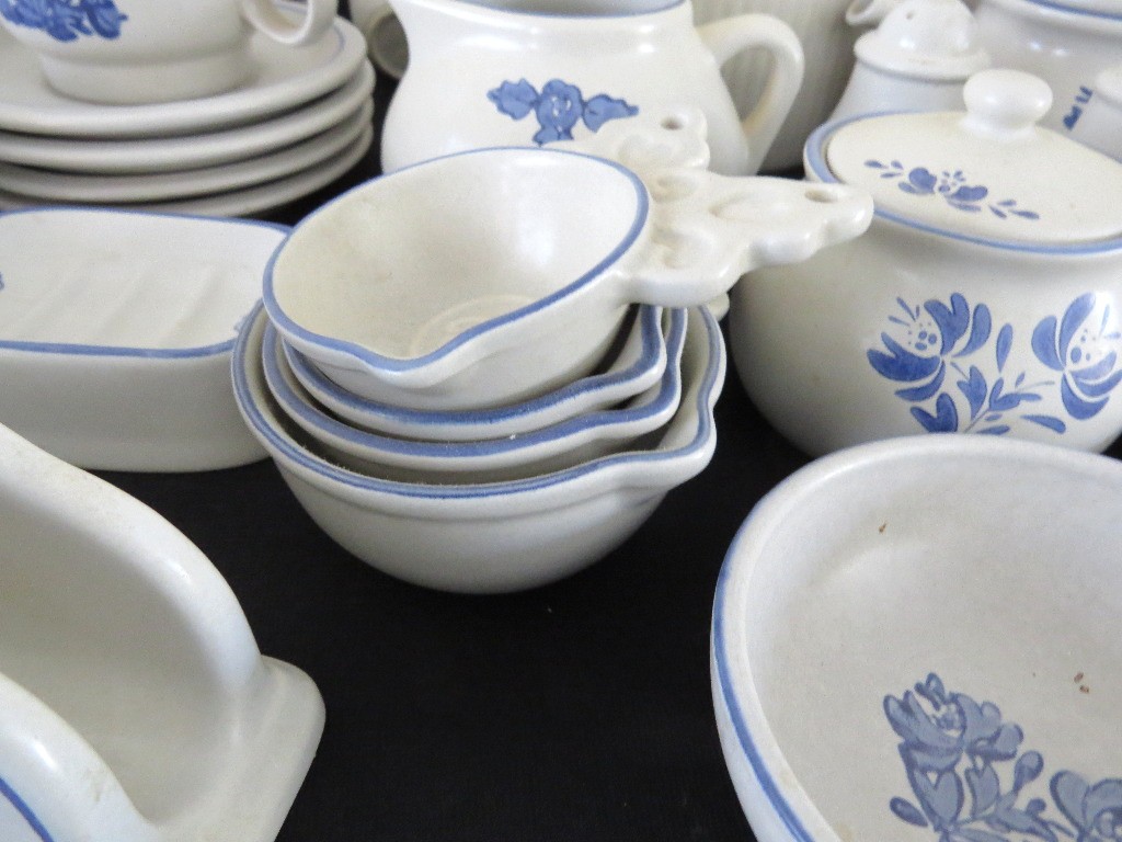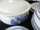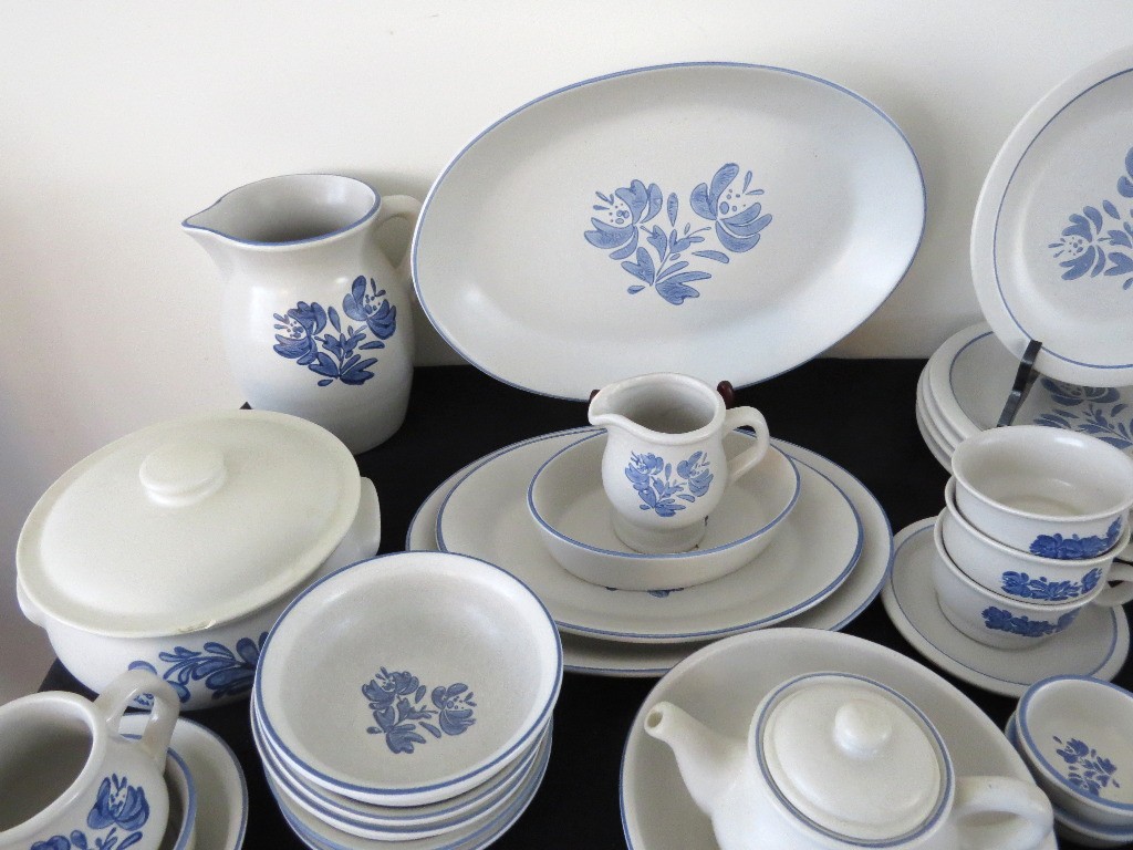 A huge assortment of Pfaltzgraff Yorktowne grey & blue pattern stoneware, some tough to find pieces in here the garlic jar, measuring cups, batter bowl and more. Many serving pieces as well as everyday dining. Of everything there only the 4pcs on the far left we found with any chipping, including the lid to the covered vegetable bowl, cereal bowl, salad plate and a small pitcher. There is one piece in the center that looks like a utensil crock which is not Pfaltzgraff, but it matches so closely it is part of this lot. A dealers delight!