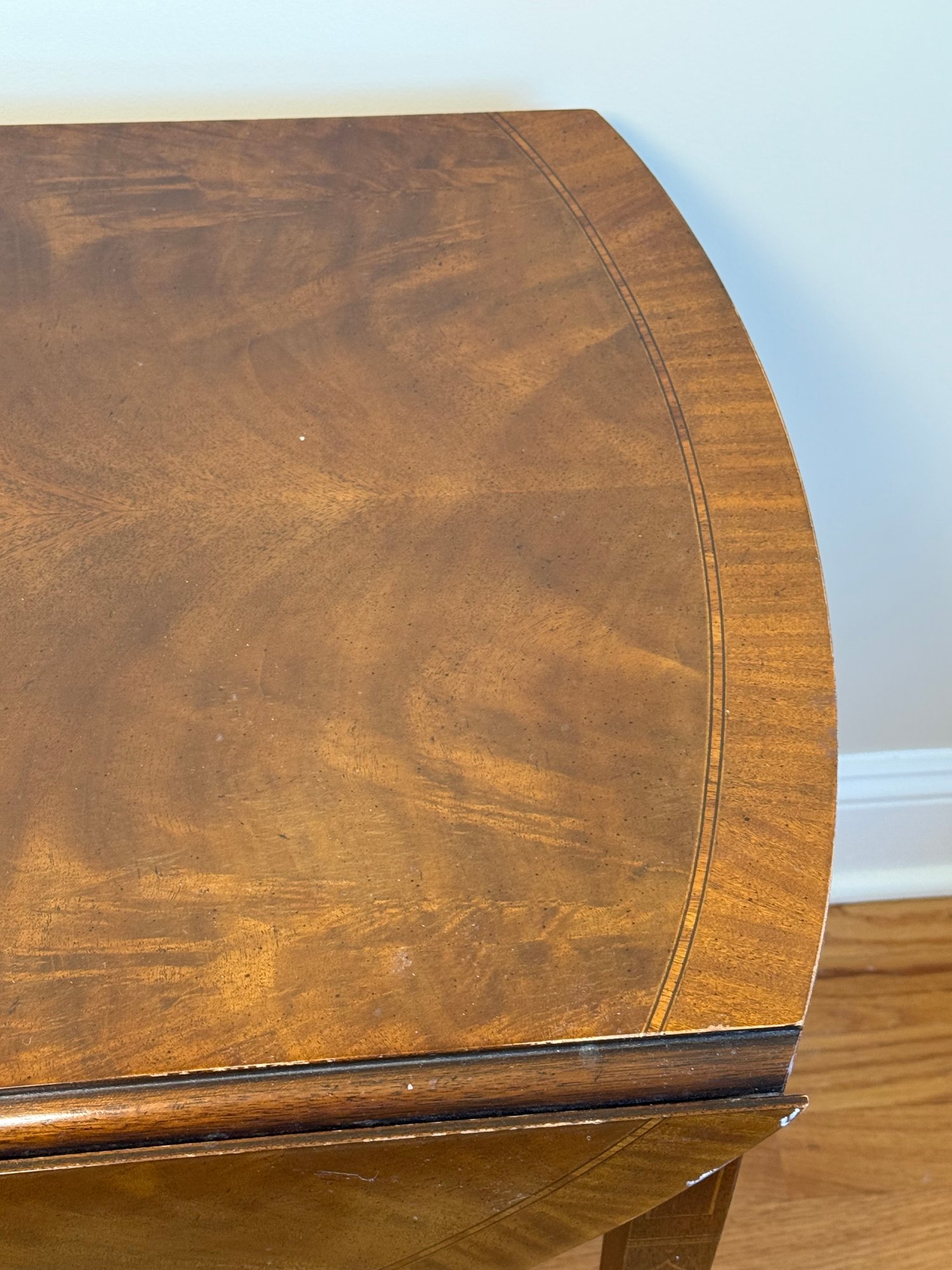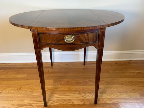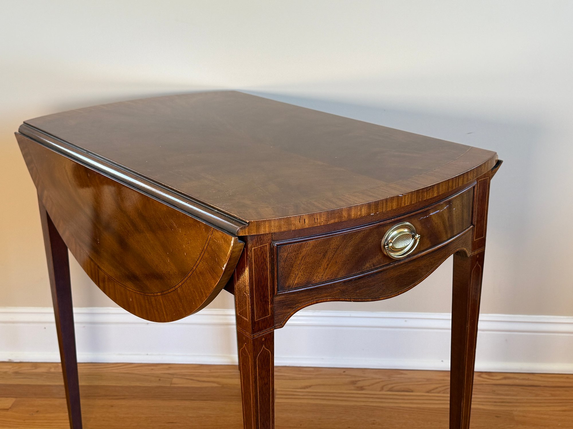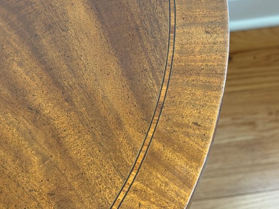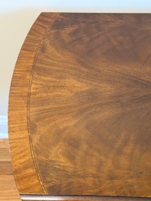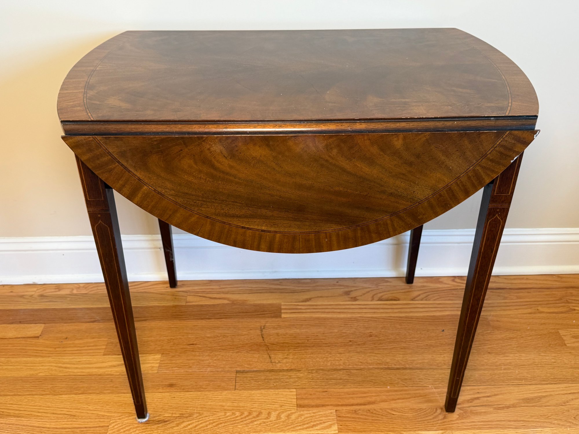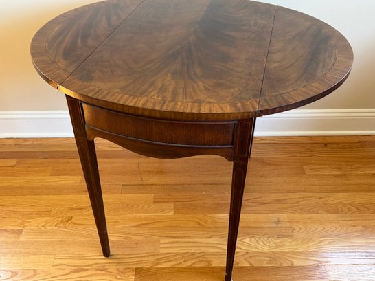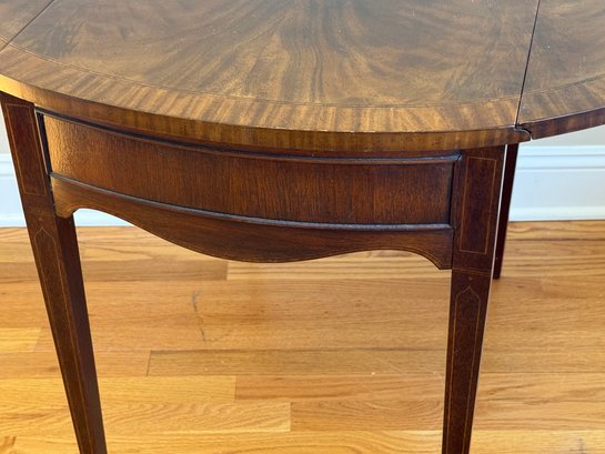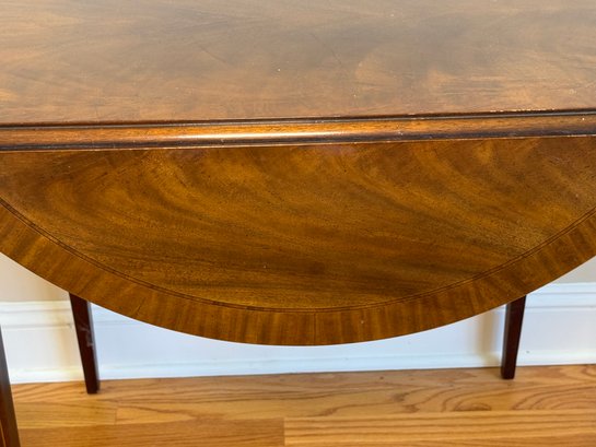 This beautiful drop leaf side table features a beautiful satinwood inlay band around the top and lovely flame wood detail.