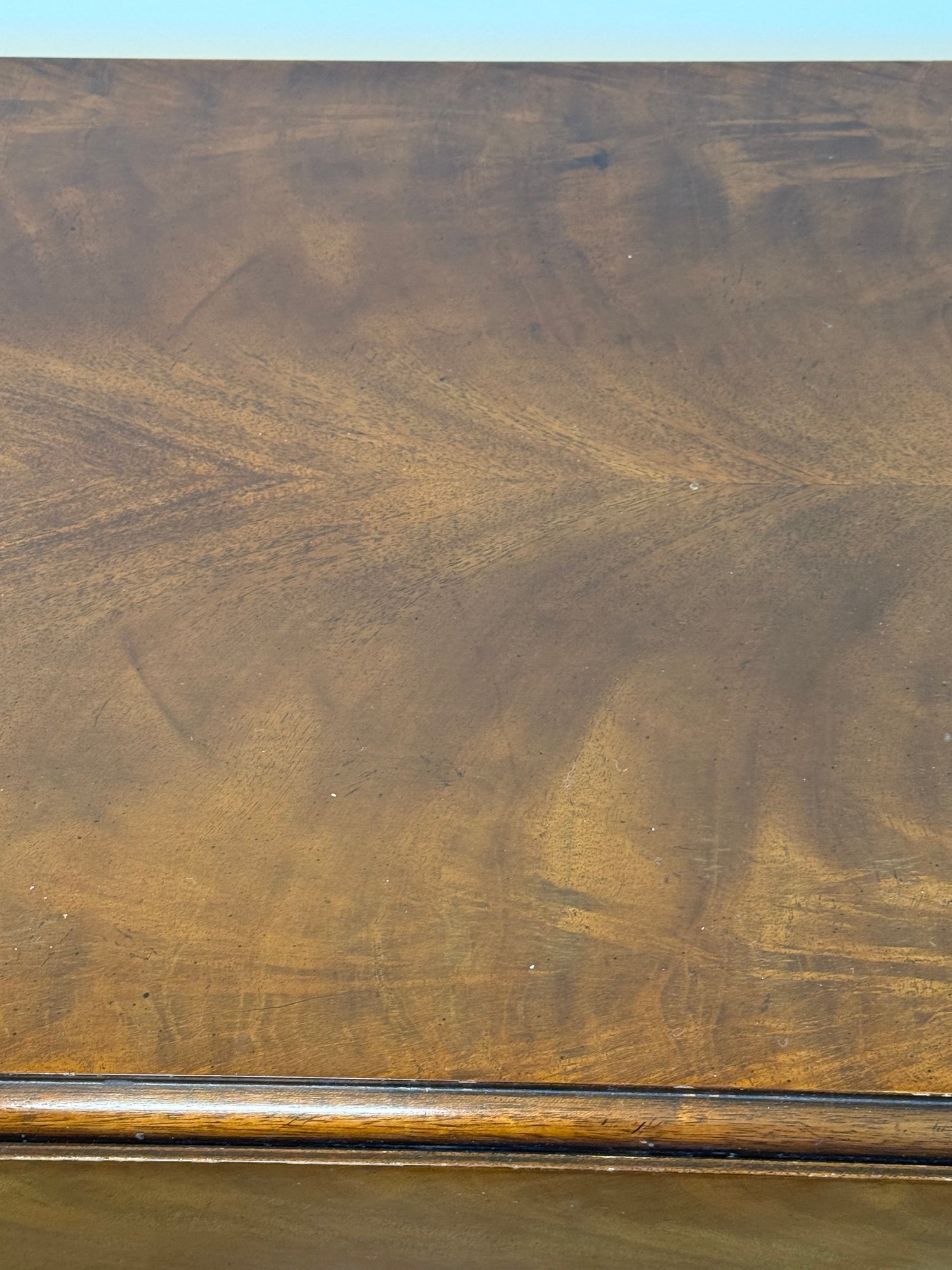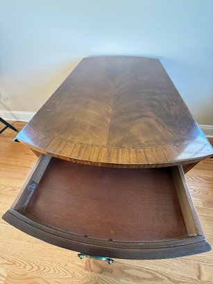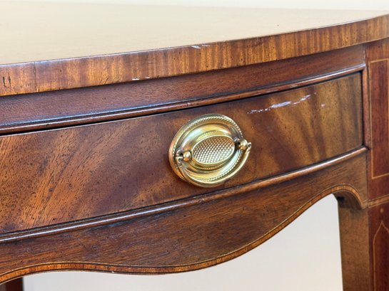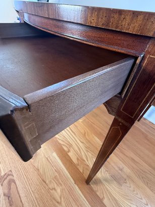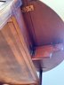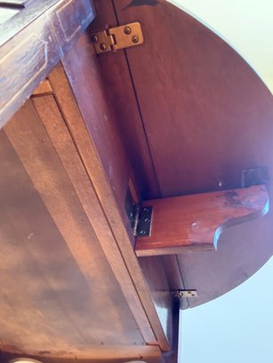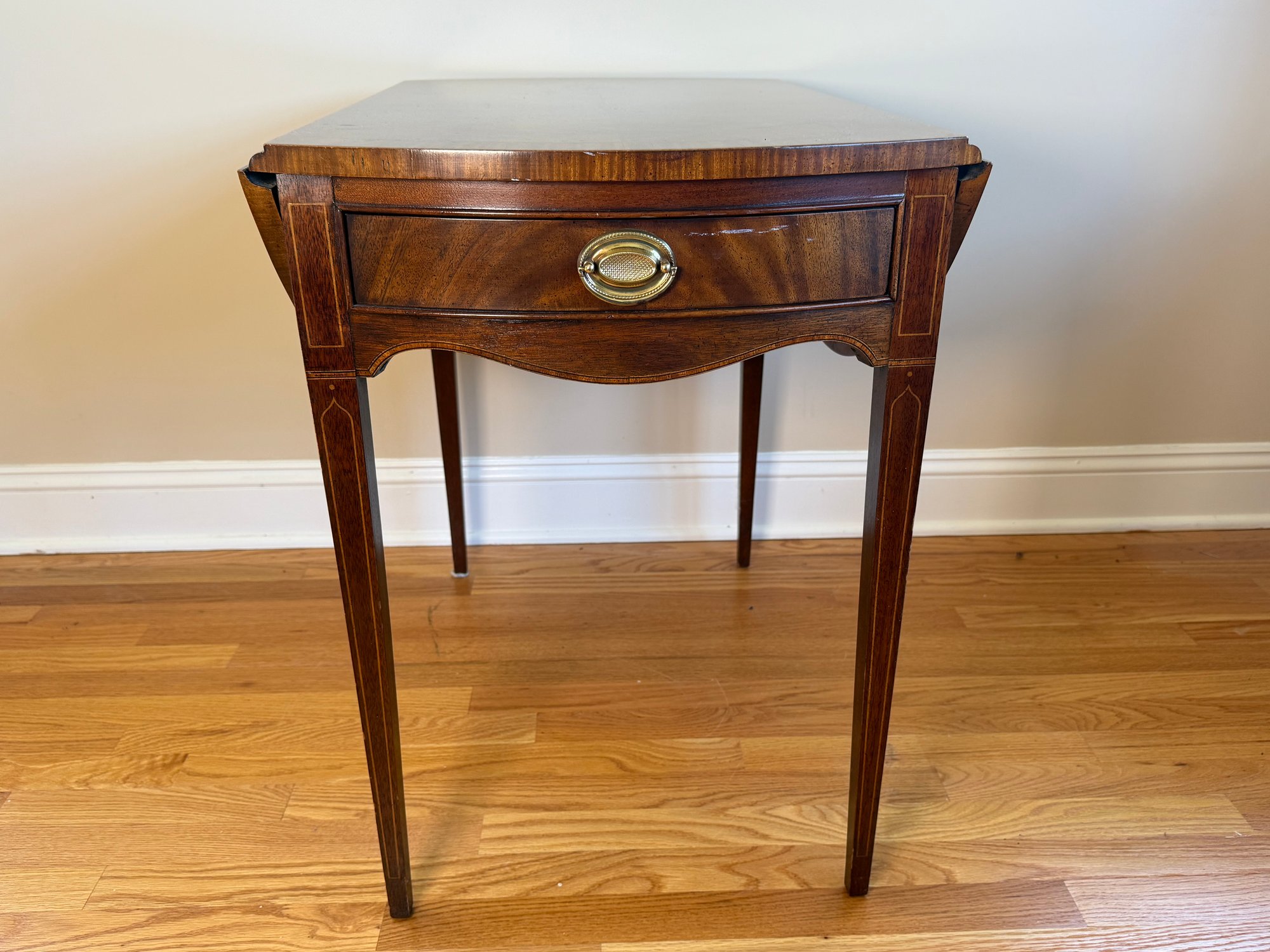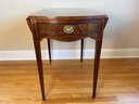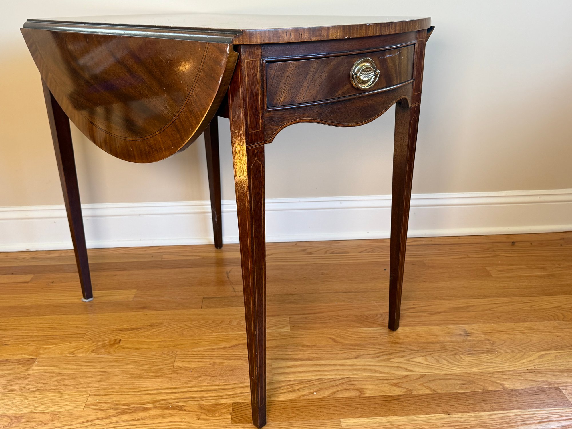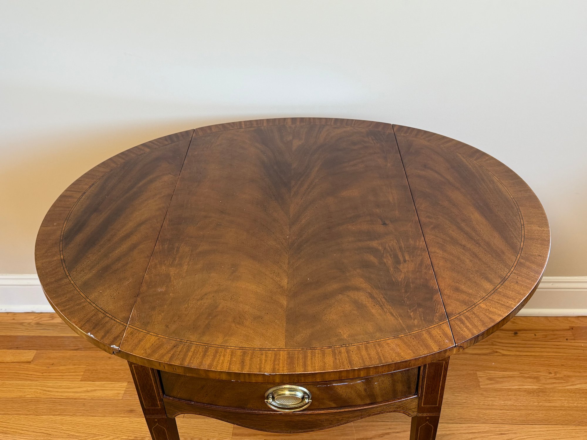 This beautiful drop leaf side table features a beautiful satinwood inlay band around the top and lovely flame wood detail.